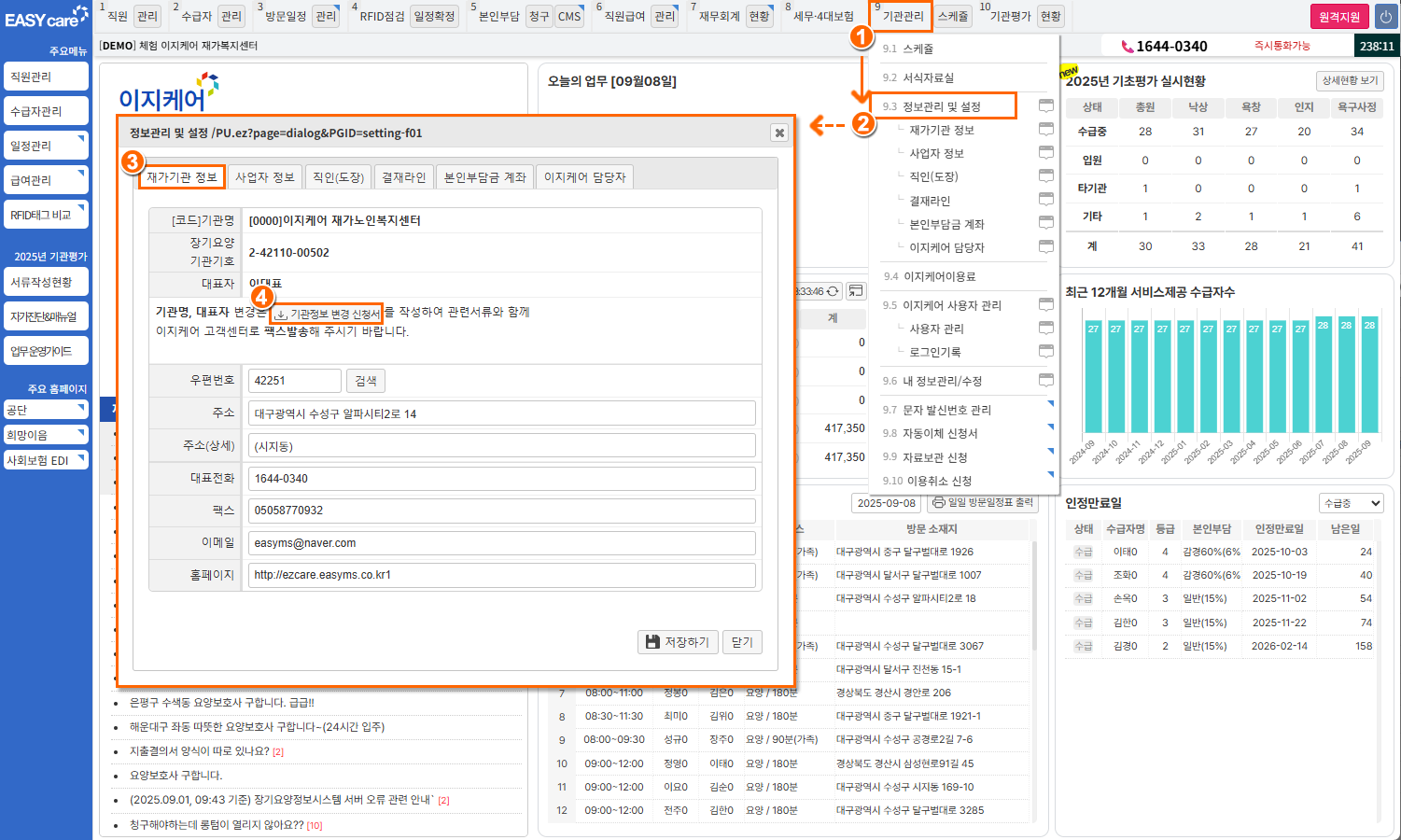 9기관관리] > [9.3정보관리 및 설정] 클릭탭: 재가기관 정보 클릭