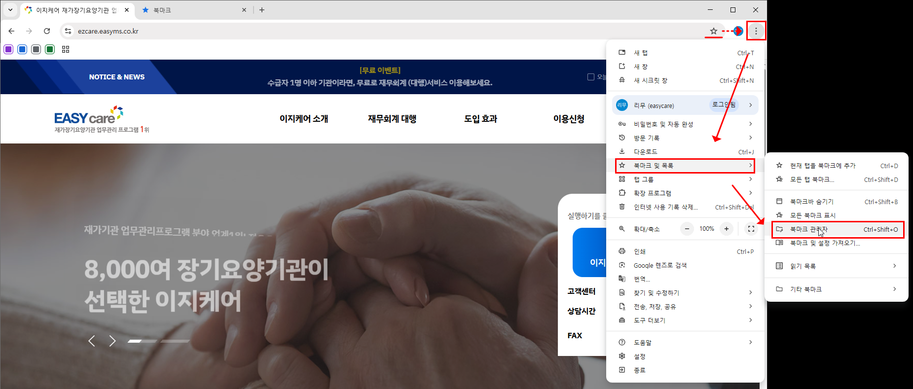 ‘이지케어’ 북마크를 드래그해서 바탕화면에 놓기