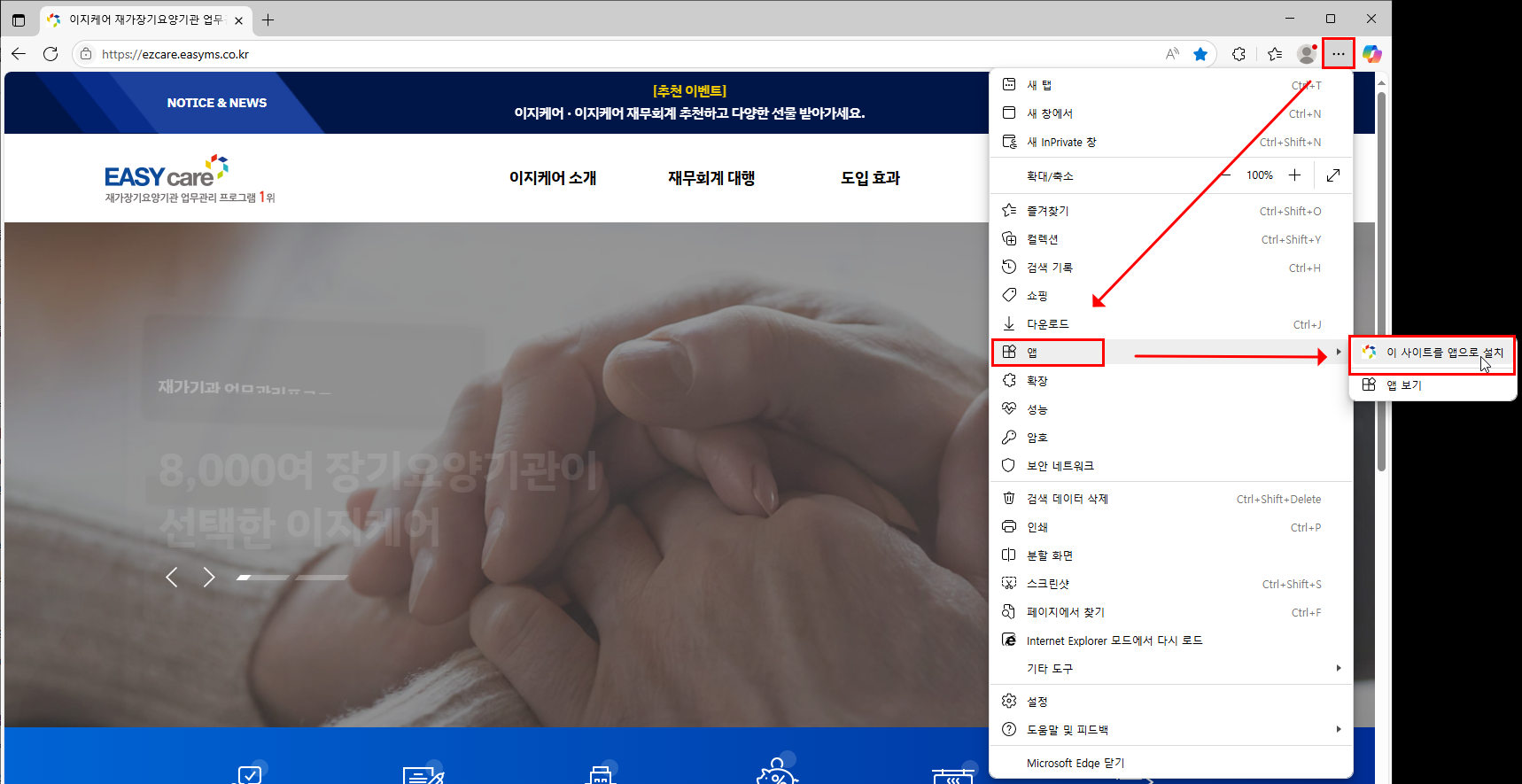 엣지에서 이지케어 https://ezcare.easyms.co.kr 접속
