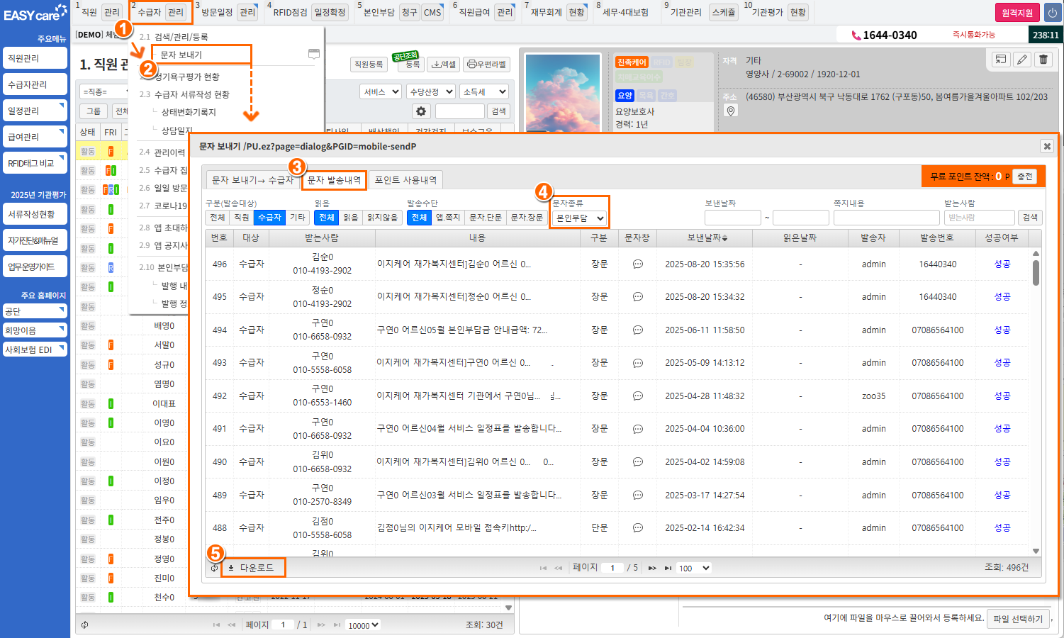 수급자에게 보낸 다양한 문자 발송 내역은 아래 경로에서 확인할 수 있습니다.
