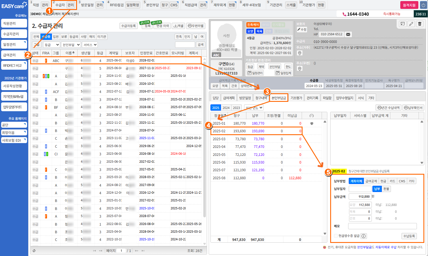 2수급자 관리] > 수급자 선택탭: 본인부담금 클릭