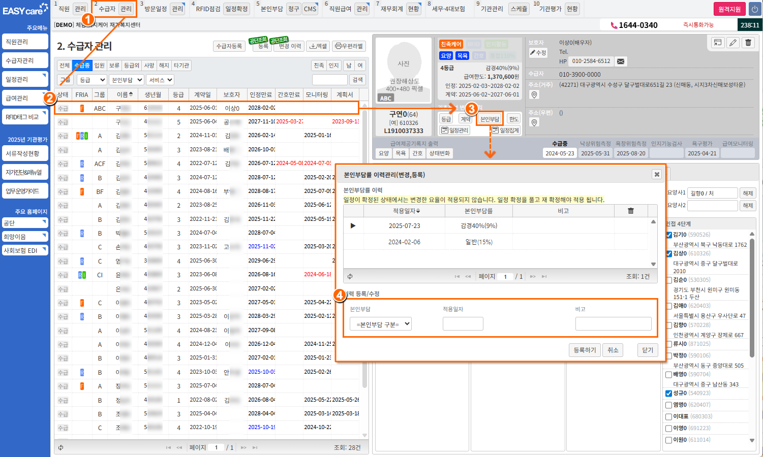 본인부담률은 방문일정과 본인부담금 계산에 영향을 미치므로 정확하게 등록할 것!