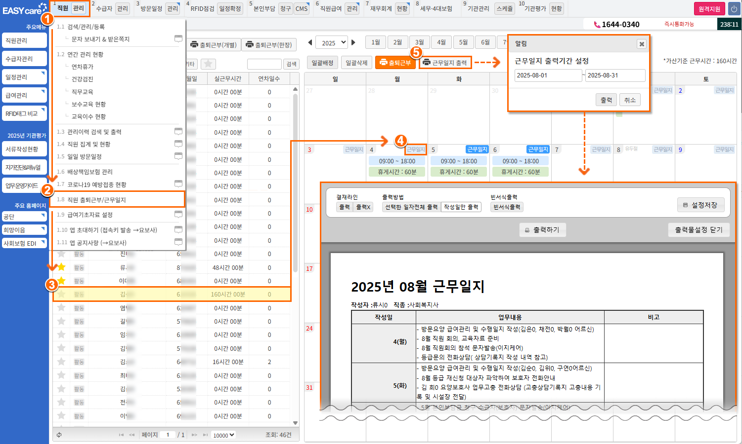 1직원] > [1.8직원 출퇴근부 / 근무일지] 클릭좌측 목록에서 직원 선택