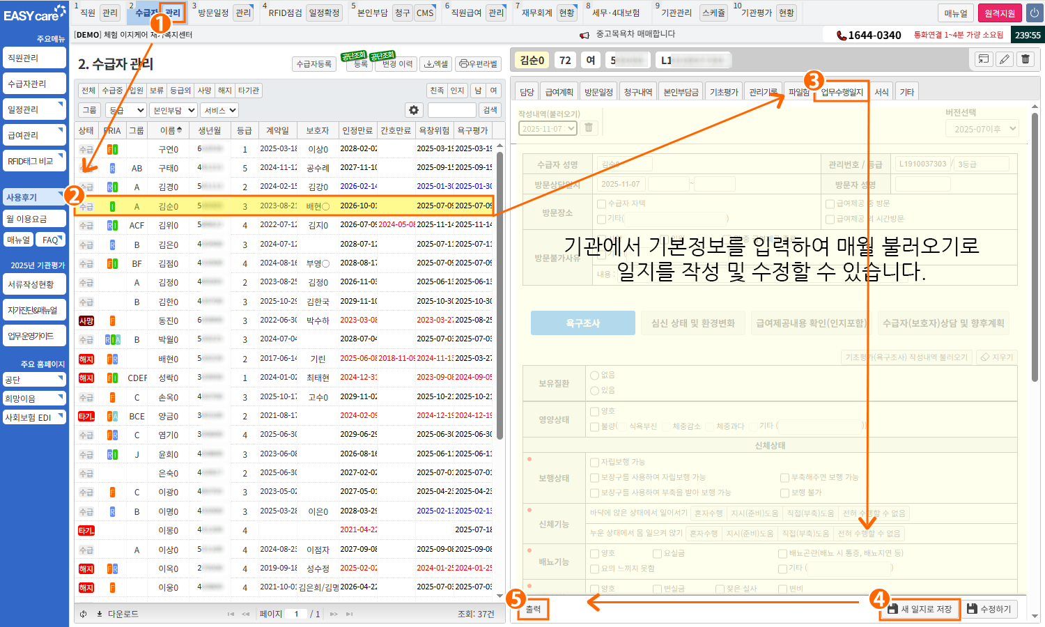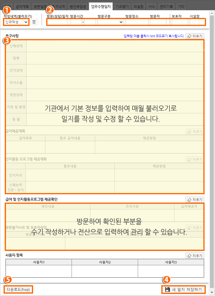 2수급자 관리] > 수급자 선택우측 탭: 업무수행일지 클릭