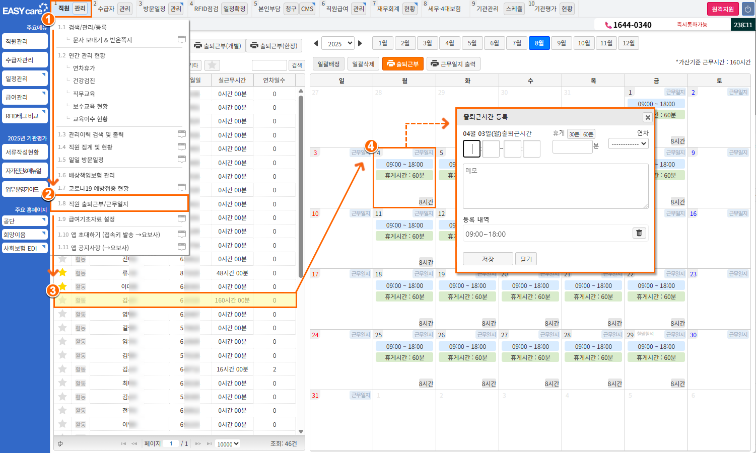 1직원] > [1.8직원 출퇴근부/근무일지] 클릭좌측에서 출퇴근부 관리할 직원 선택