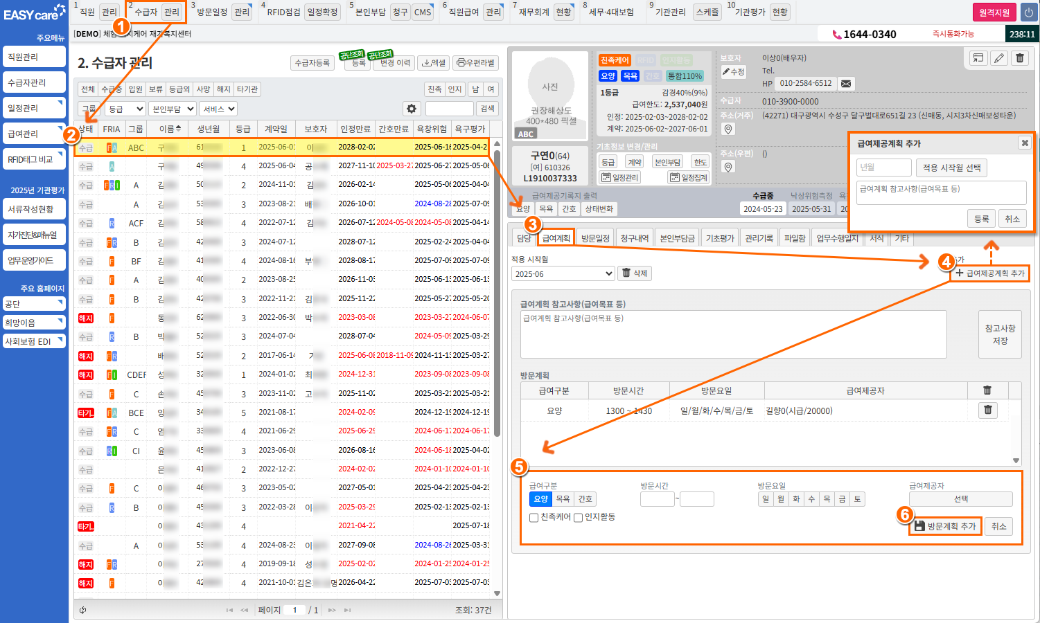 2수급자 관리] > 수급자 선택우측 탭: 급여계획 클릭