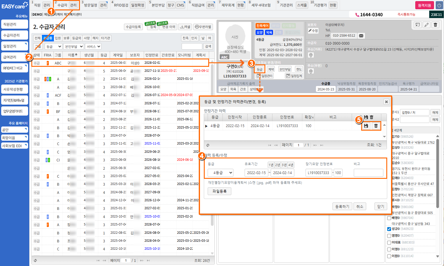 2수급자 관리] > 수급자 선택우측 사진 등록창 옆 "등급" 클릭