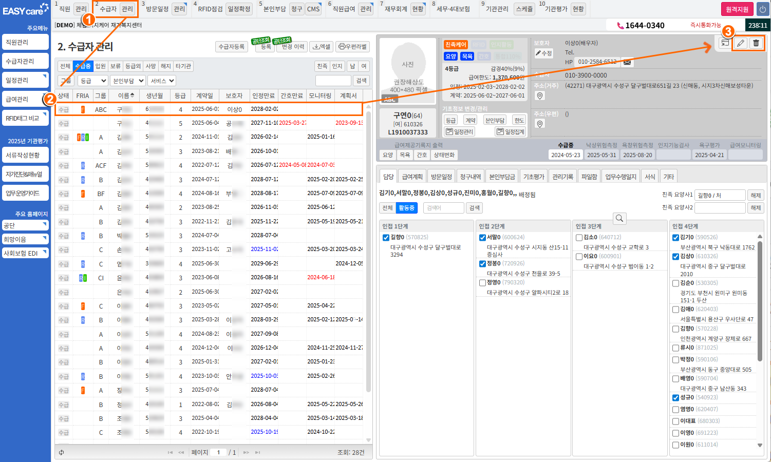 수급자 정보 수정[2 수급자 관리] > 수급자 선택오른쪽 상단 "연필 " 아이콘 클릭수급자 정보 수정수급자 삭제[2 수급자 관리] > 수급자 선택오른쪽 상단 "휴지통 🗑" 아이콘 클릭수급자 삭제주의사항수정은 언제든지 가능단, 해당 수급자와 연관된 자료(방문일정, 제공기록 등)가 있을 경우 삭제 불가능