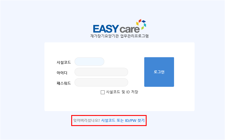 로그인 화면 하단 → "시설코드 또는 ID/PW 찾기" 버튼 클릭