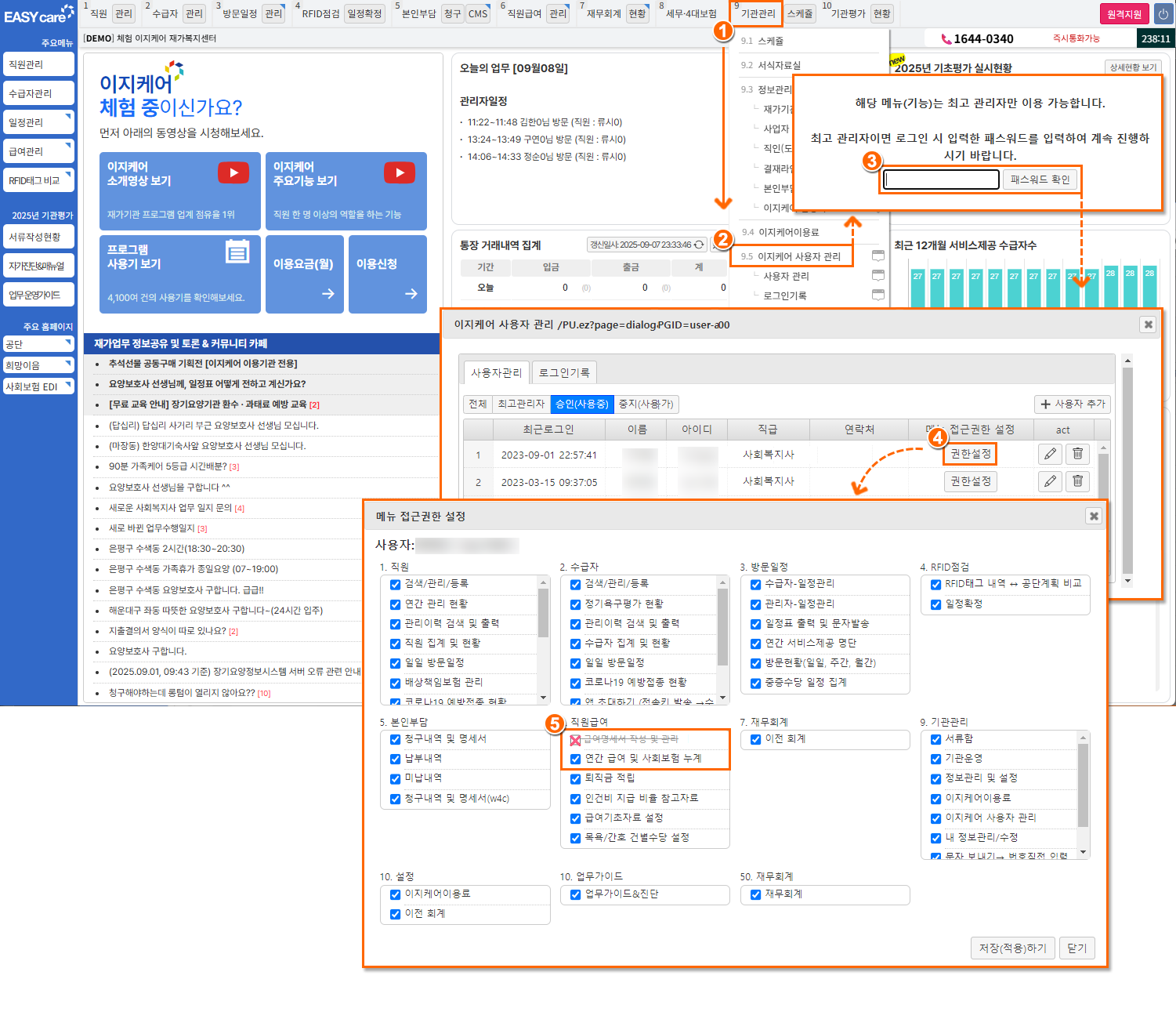2. [9 기관관리] > [9.5 이지케어 사용자 관리] 클릭