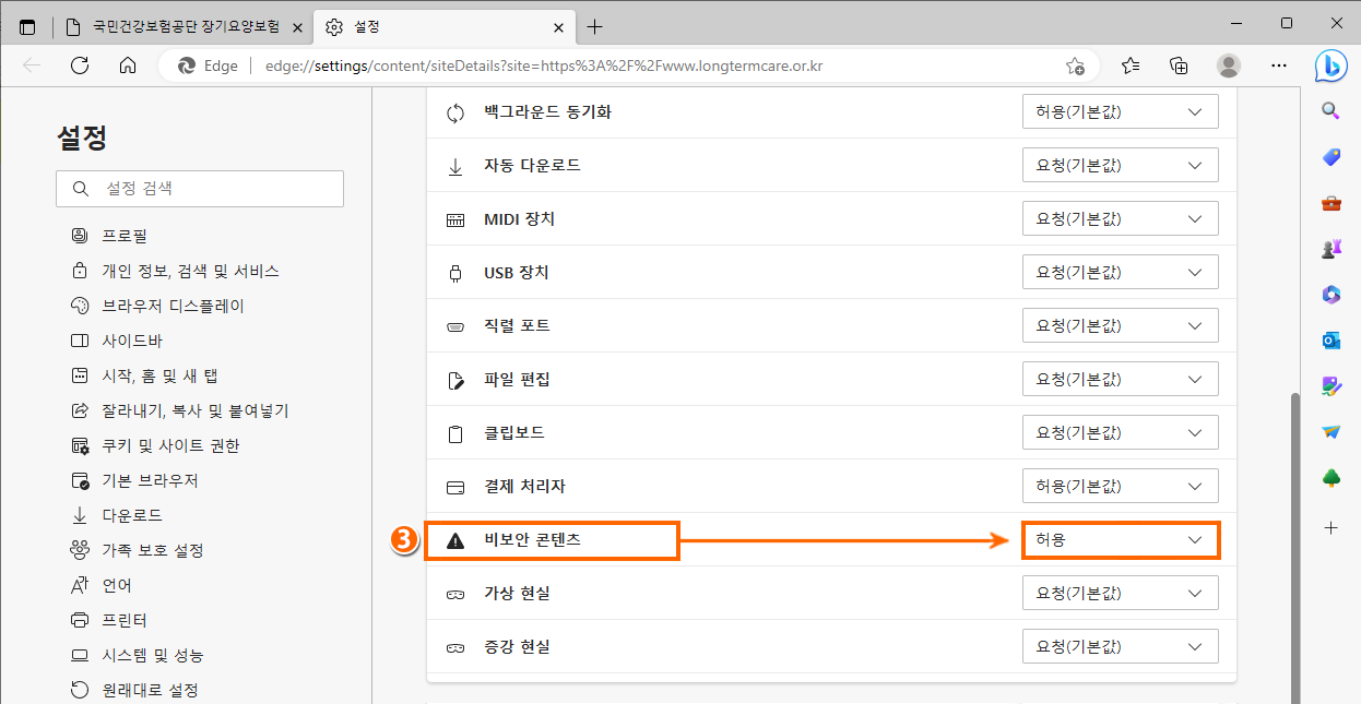 설정 목록 중 "비보안 콘텐츠" 항목을 기본값인 차단 → 허용으로 변경