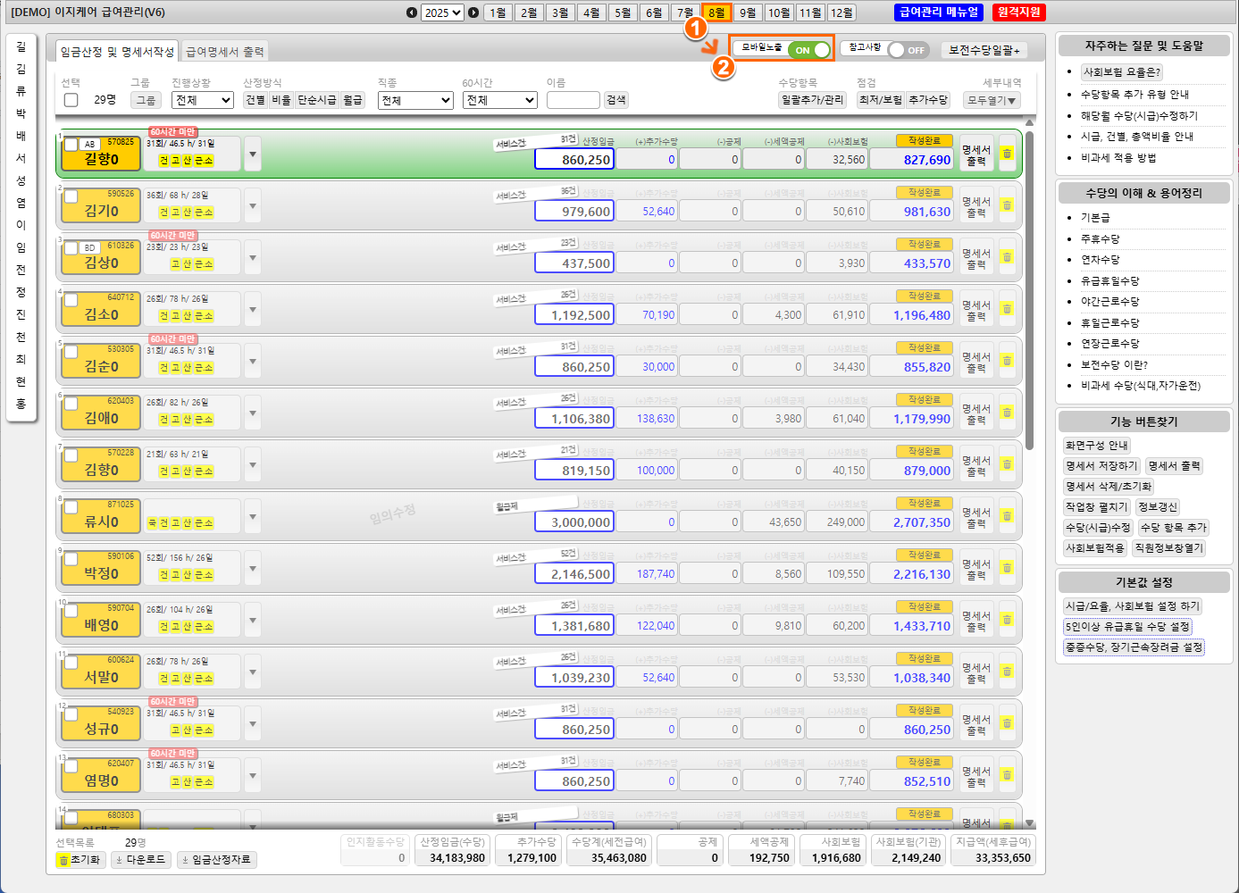 6직원급여 관리] > 급여 월 선택우측 상단 모바일 노출 ON 설정