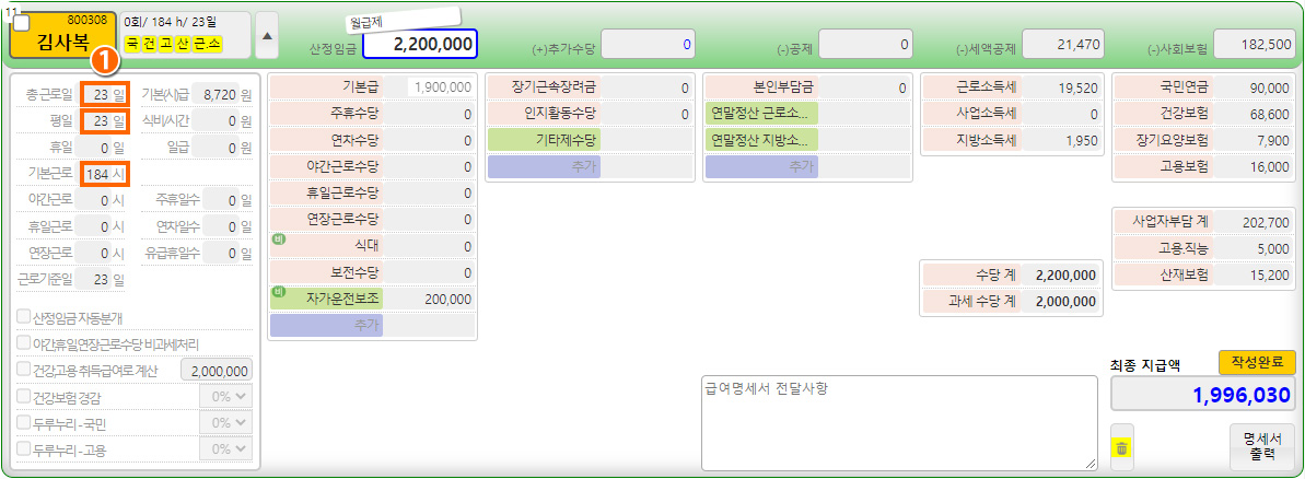 세부내역 항목 중 총근로일 / 기본근로시간 직접 입력 후 명세서 확정