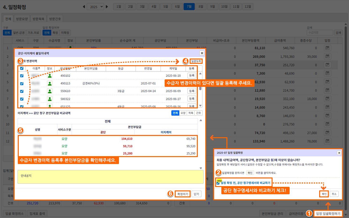 • 일정이 확정된 이후에는 변경이력이 자동 반영되지 않으므로 확정 전에 반드시 본인부담금 내역을 다시 확인해 주세요.