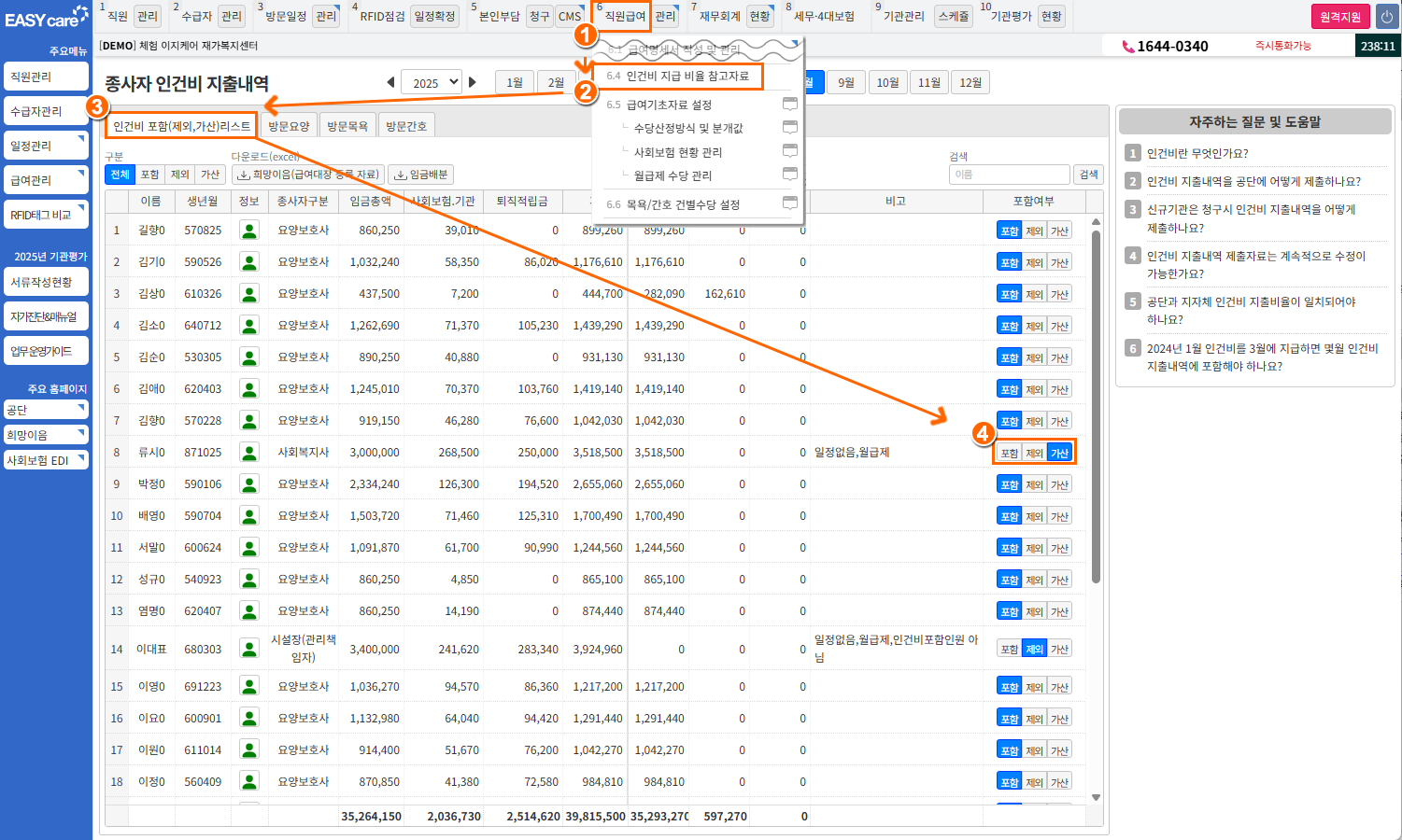 6직원급여] > [6.4인건비 지급 비율 참고자료] 클릭좌측 상단 탭: 인건비 포함(제외, 가산)리스트 클릭