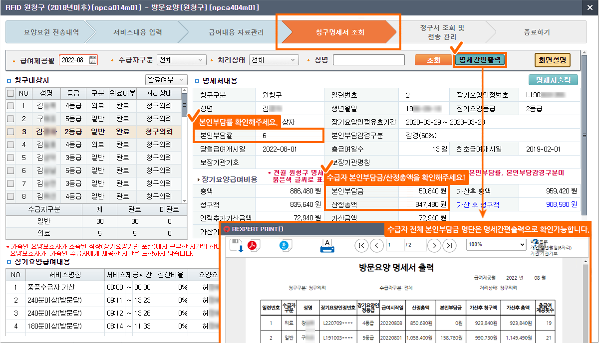 4일정확정] 화면에서 본인부담금 금액 확인수급자별 본인부담금이 공단과 일치하는지 확인 필수!