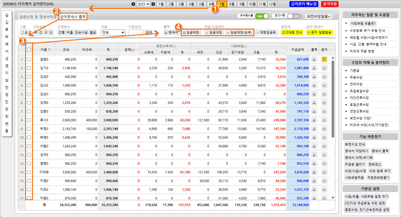 임금대장을 출력하려면 어떤 메뉴로 가야 하나요?
