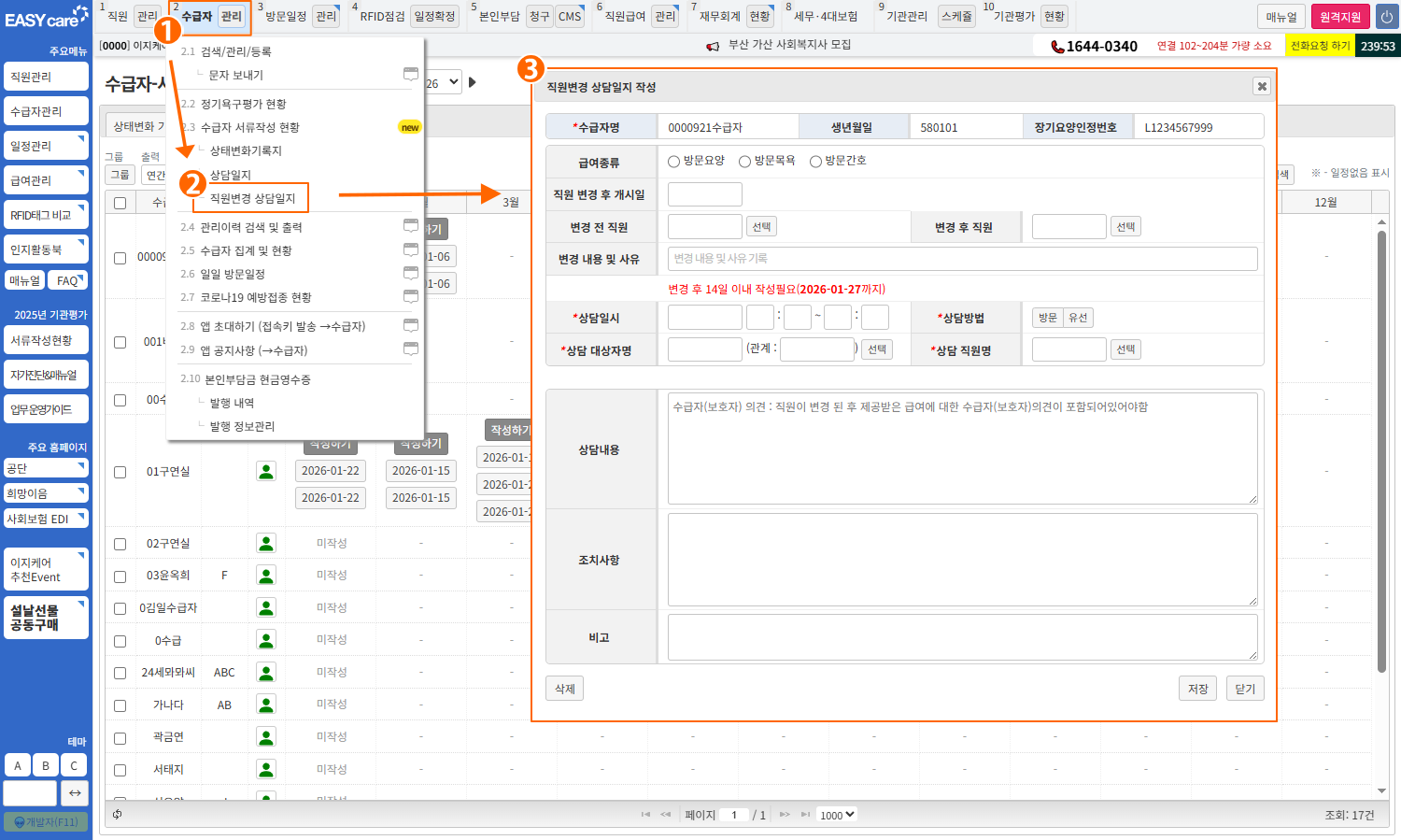 원하는 수급자에게 직원 변경 상담일지 작성