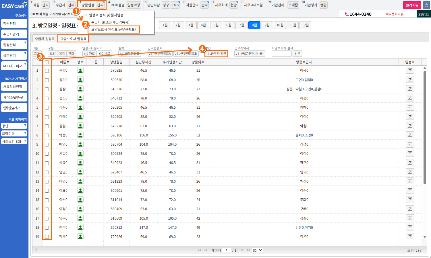 [3 방문일정] > [3.3 요양보호사 일정표(근무현황표)] 클릭