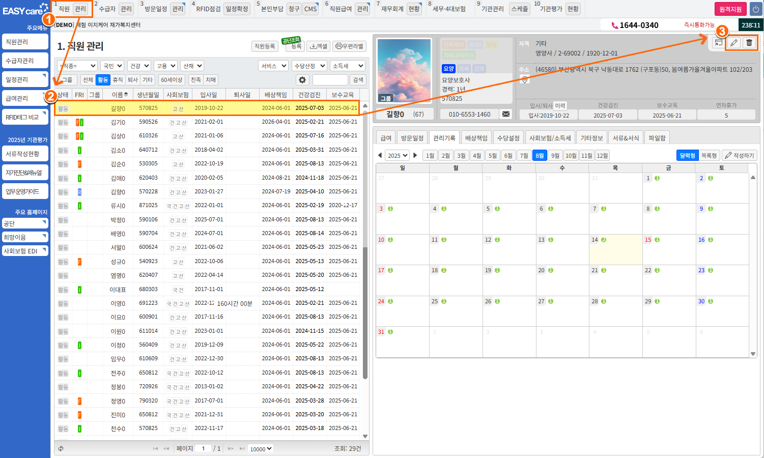등록된 직원의 인적 사항, 연락처 등 정보를 수정하거나 삭제 처리할 수 있어요.