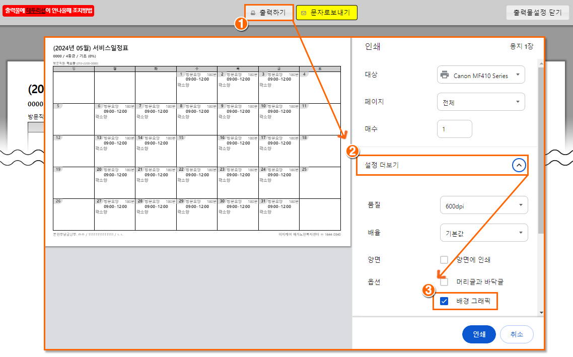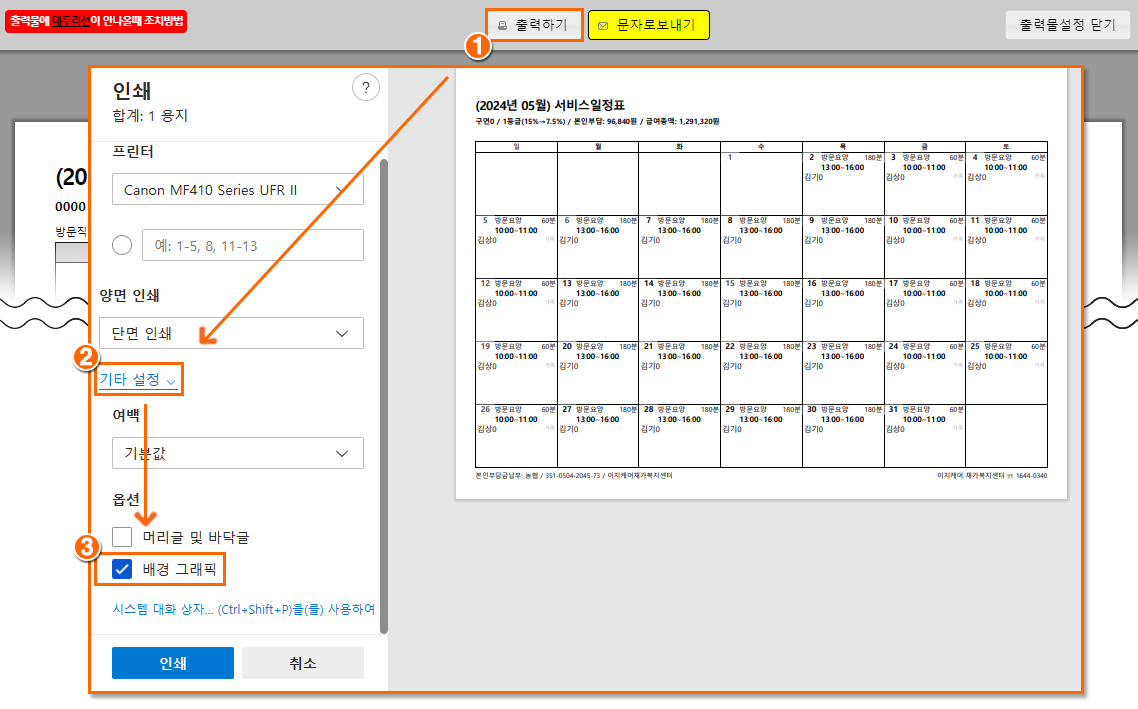 일정표, 표 형식 문서, 디자인 요소가 포함된 서식을 인쇄할 때는 꼭 설정을 확인해 주세요.