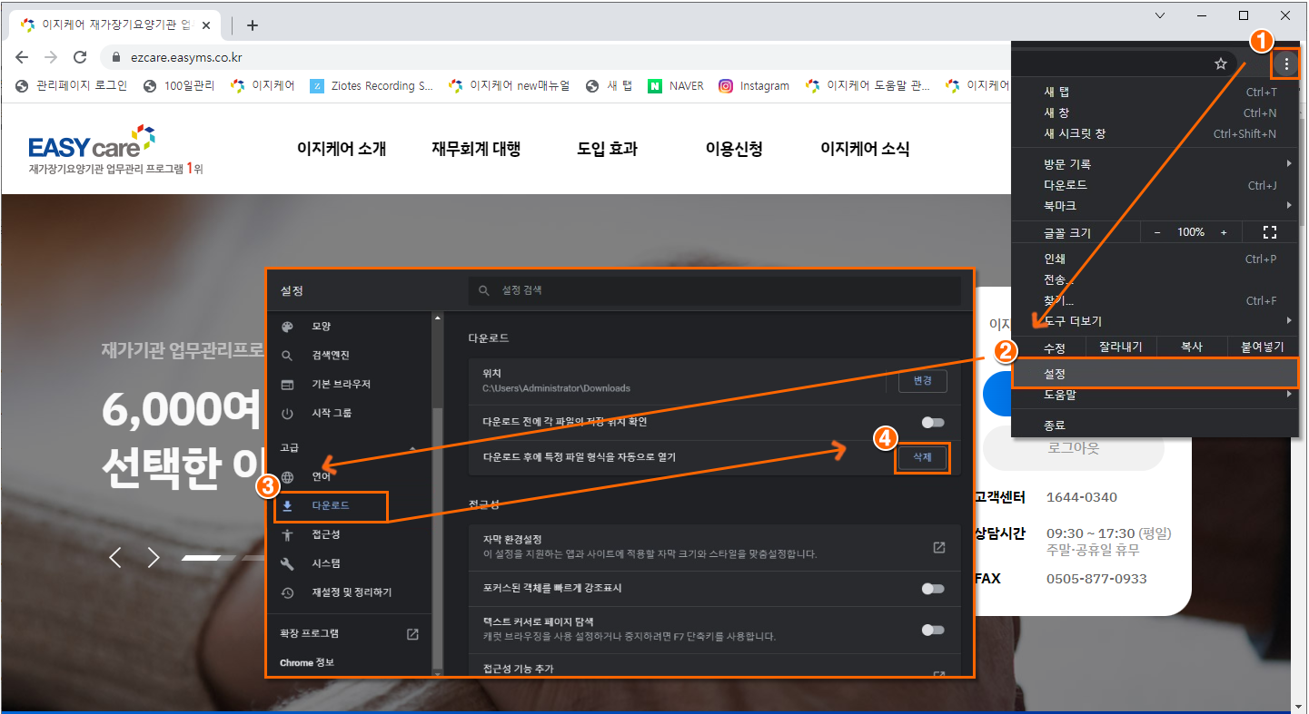 ︙클릭 > 설정 이동좌측 메뉴에서 다운로드 클릭