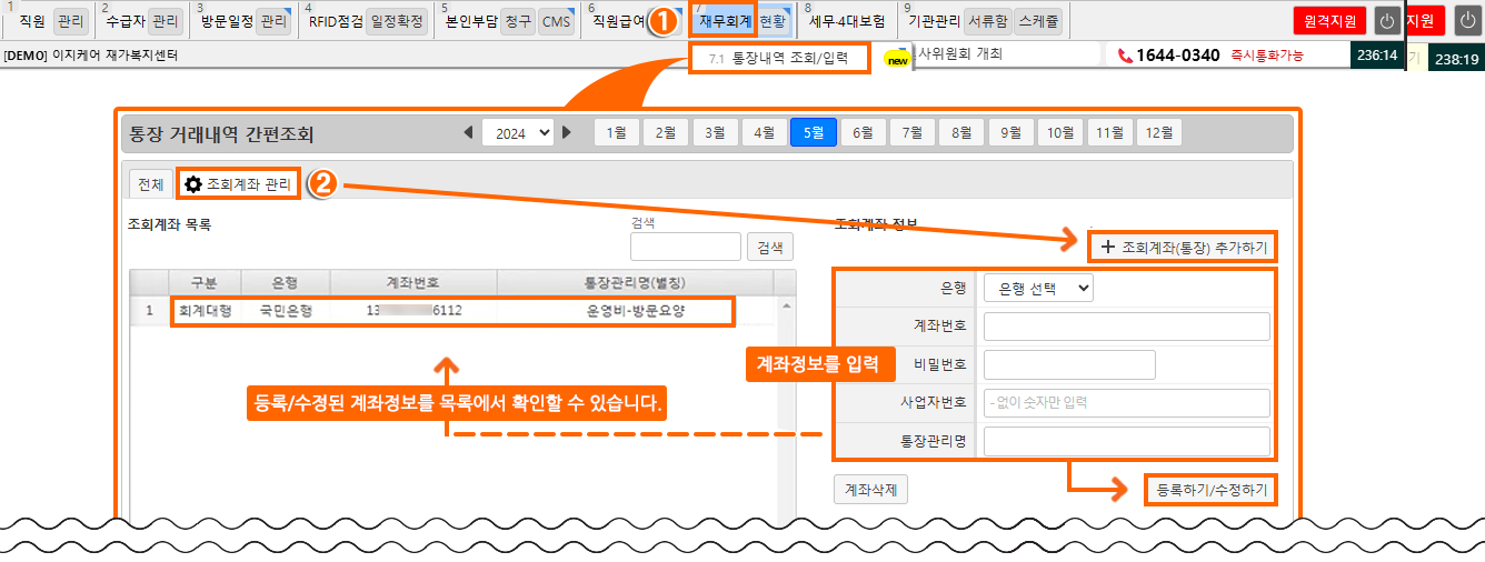 7.1통장내역 조회/입력]> 조회계좌 관리"+ 조회계좌(통장) 추가하기"를 통해 계좌 등록