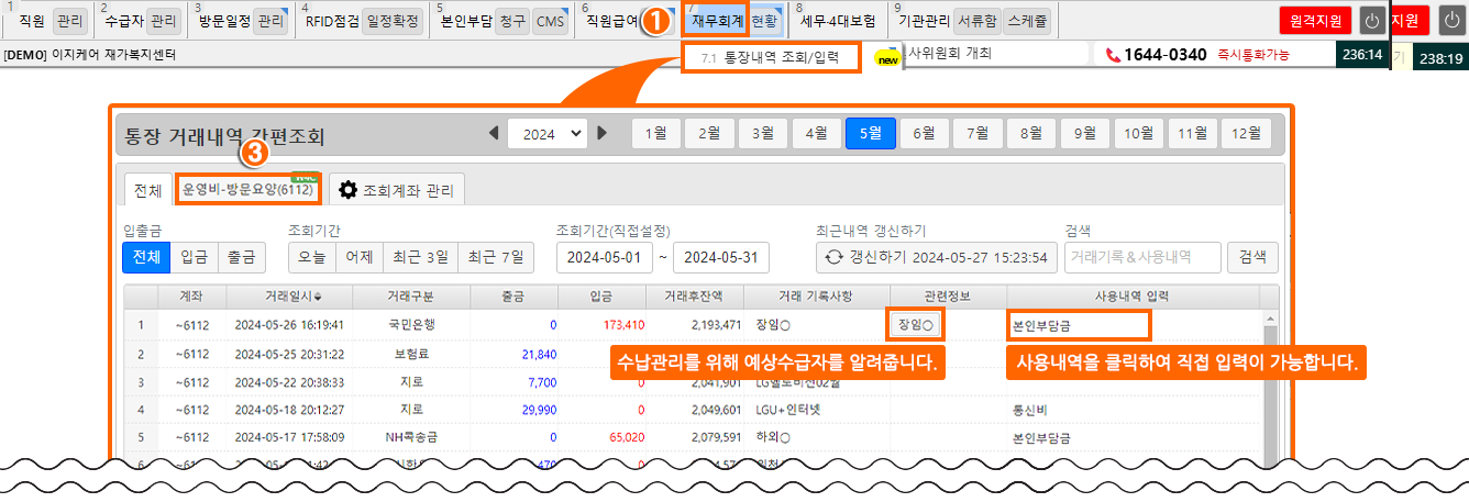 거래 내역(입금/출금/기간별)을 확인 가능