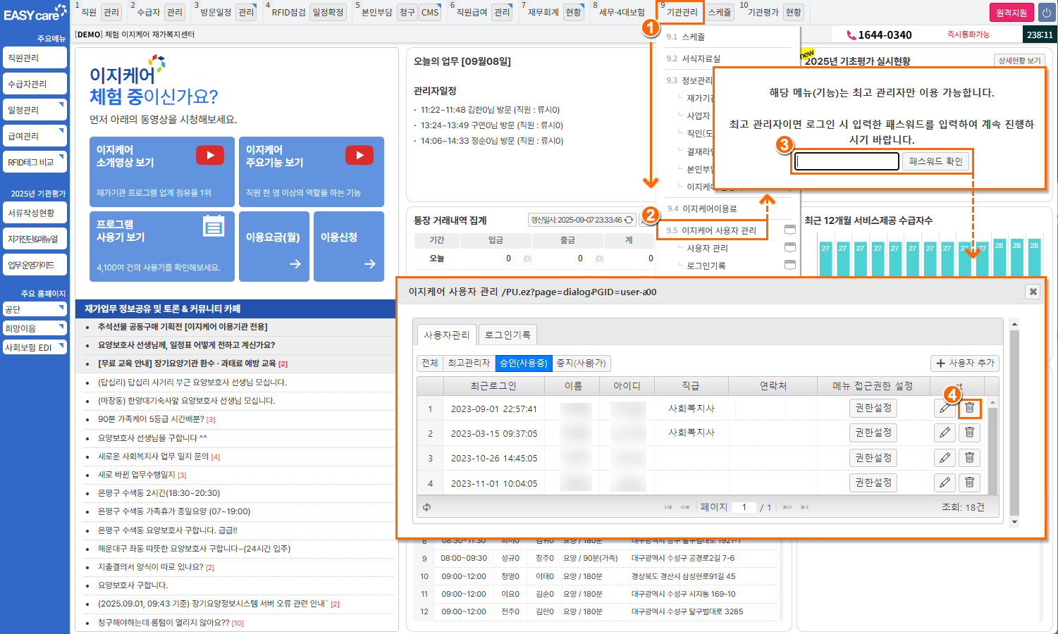 9기관관리] > [9.5이지케어 사용자 관리] 클릭비밀번호 입력 후 최고관리자 인증