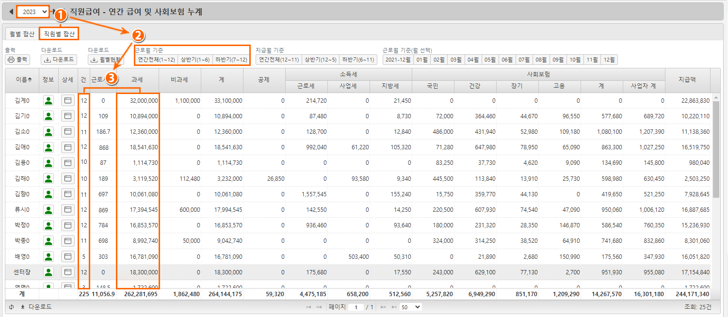직원별 연간 급여 및 보수총액은 프로그램에서 집계 조회할 수 있어요.