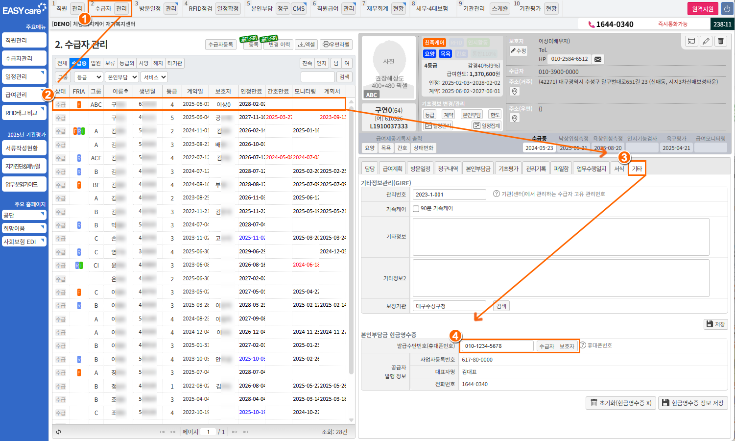 하단 본인부담금 현금영수증 영역에서 현금영수증 발급을 요청하는 수급자(보호자) 휴대폰 번호를 등록, 변경할 수 있습니다.