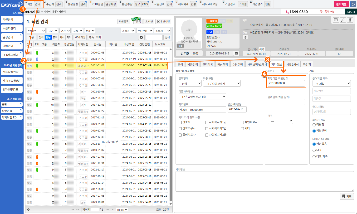 희망이음 시스템 연계를 위해 발급받은 직원번호는 이지케어 직원 정보에서 입력할 수 있어요.