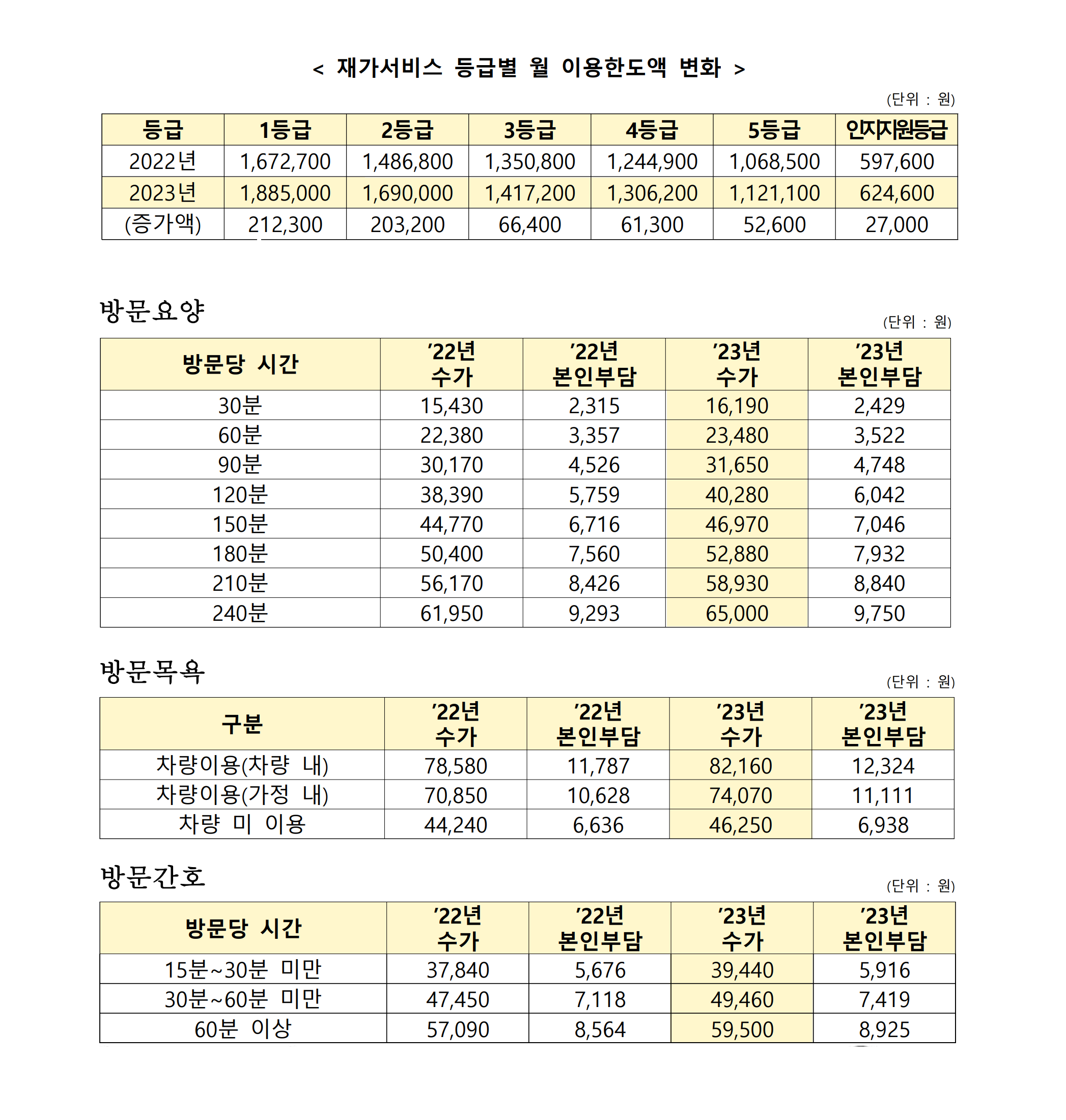 2023년도 장기요양등급별 월 급여한도액과 방문요양·방문간호 등 재가급여 수가 기준을 정리한 자료입니다