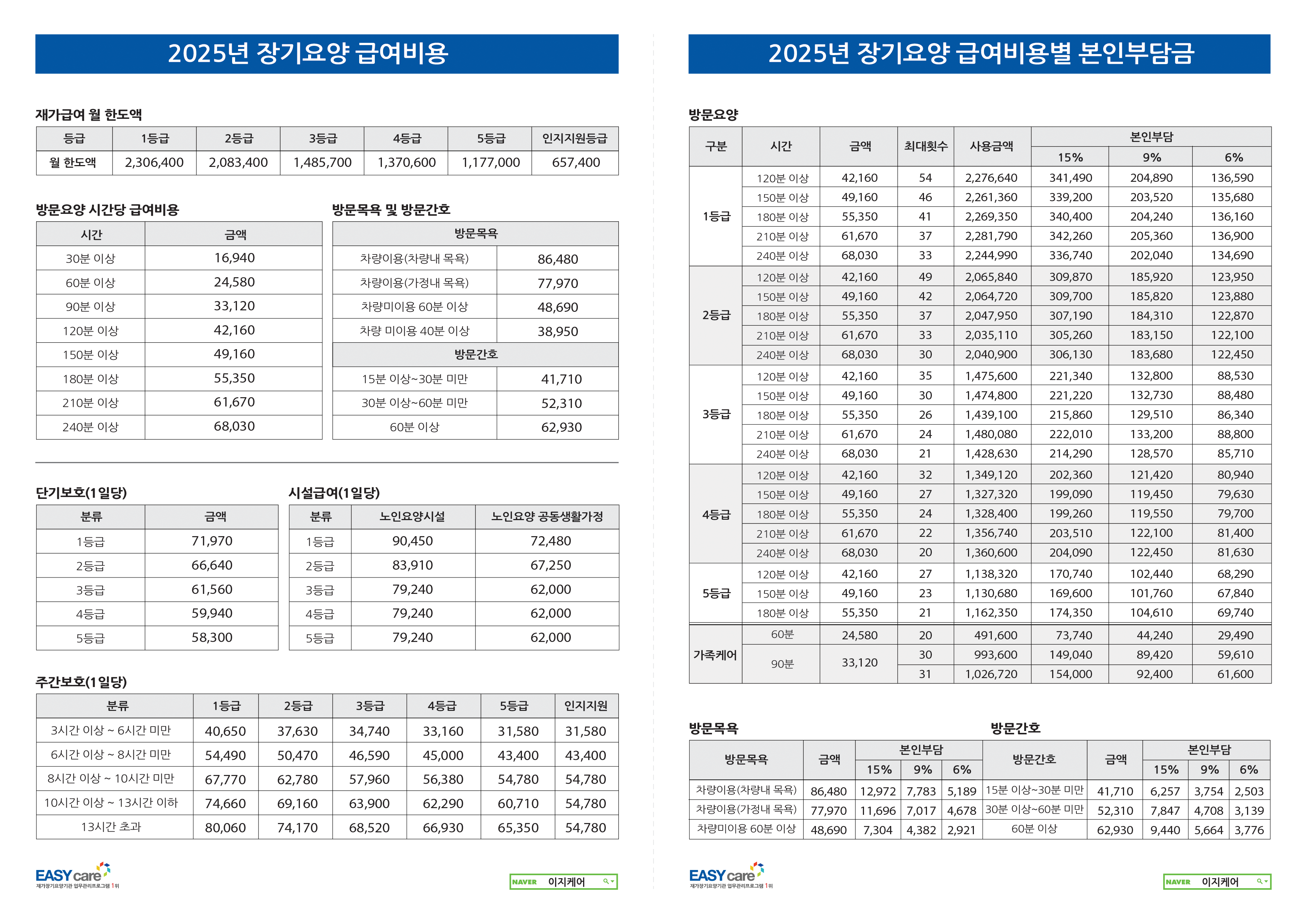2025년 등급별 월 한도액, 수가, 예상 본인부담금제공 내용등급별 월 한도액방문요양·방문목욕·방문간호 시간당 수가예상 본인부담금 금액출력방법이미지 우측 상단 또는 본문 위에 위치한 급여비용표는 마우스 우클릭 > 다른 이름으로 저장 후 인쇄