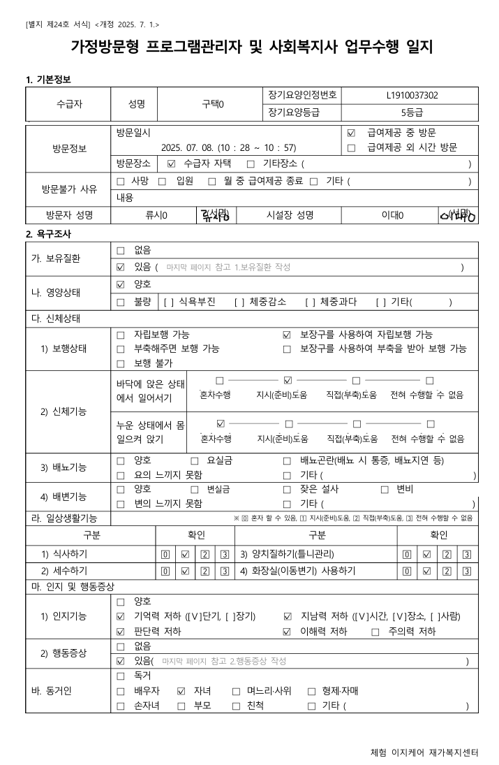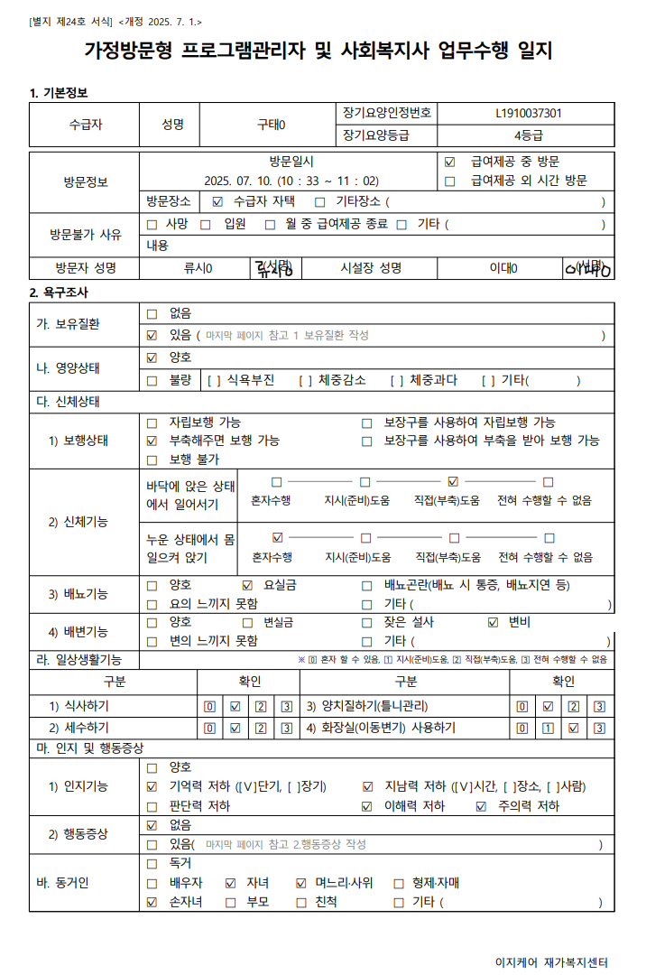- 수급자 요구 확인: 서비스 요청, 건강상태 변화 등 체크