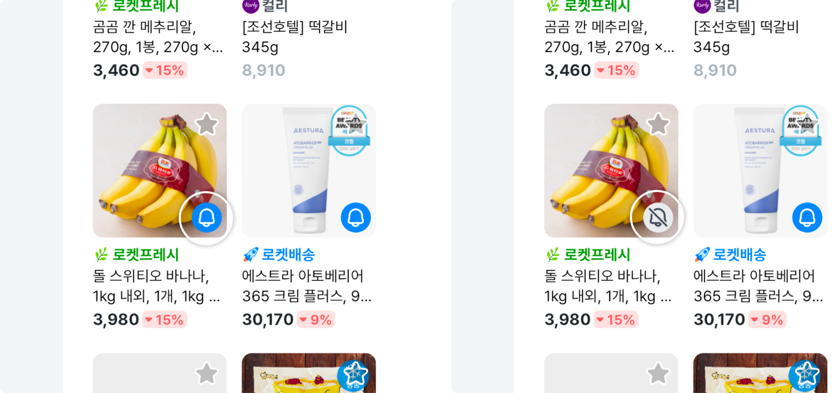 선택한 상품 중 하나라도 알림이 켜져 있다면 버튼은 ‘끄기’로 설정돼요. 선택한 상품의 알림을 한번에 켜고 싶다면 선택한 상품 중에 알림이 켜진 상품이 포함되어 있지 않으면 버튼이 ‘켜기’로 보여요.