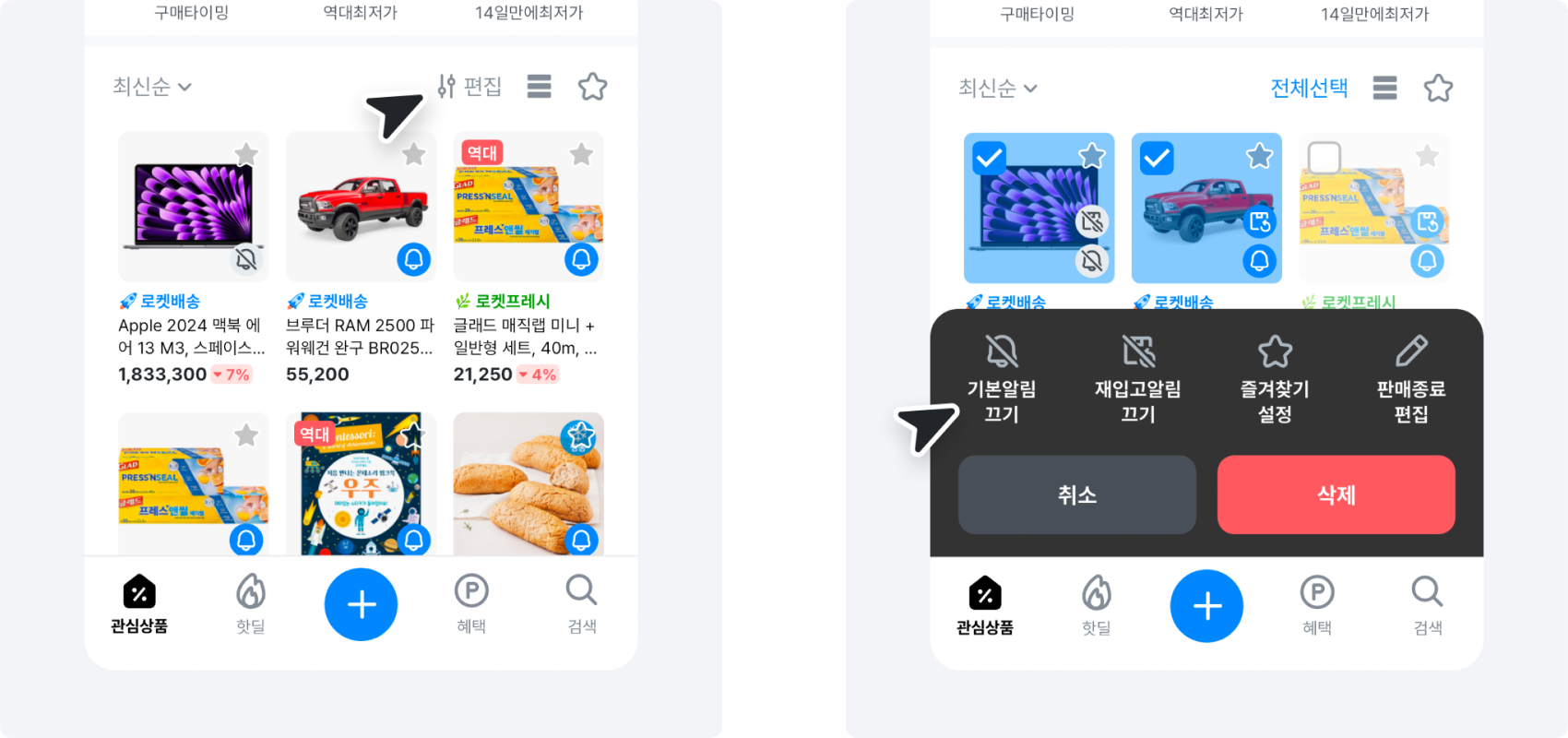관심상품 목록 [편집] → 전체선택 또는 일부 상품 선택 → [기본알림 켜기/끄기]