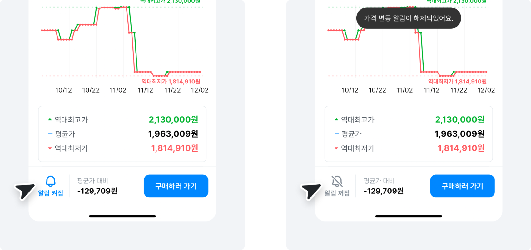 상품 상세페이지 하단 왼쪽에서 알림을 제어할 수 있어요.