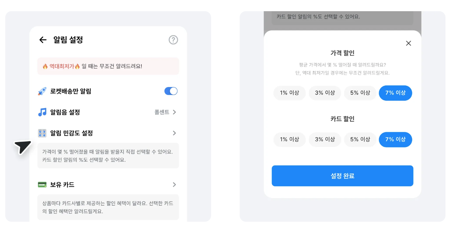역대최저가인 경우 알림 민감도 설정과 상관없이 무조건 알려드려요.