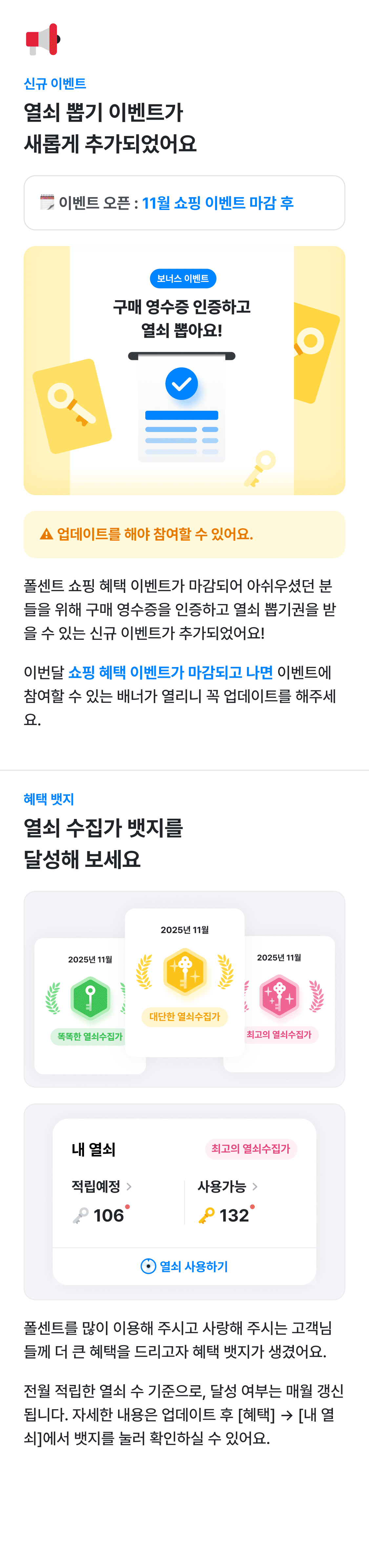 자세한 내용은 업데이트 후 [혜택] > [내 열쇠]에서 뱃지를 눌러 확인하실 수 있어요.