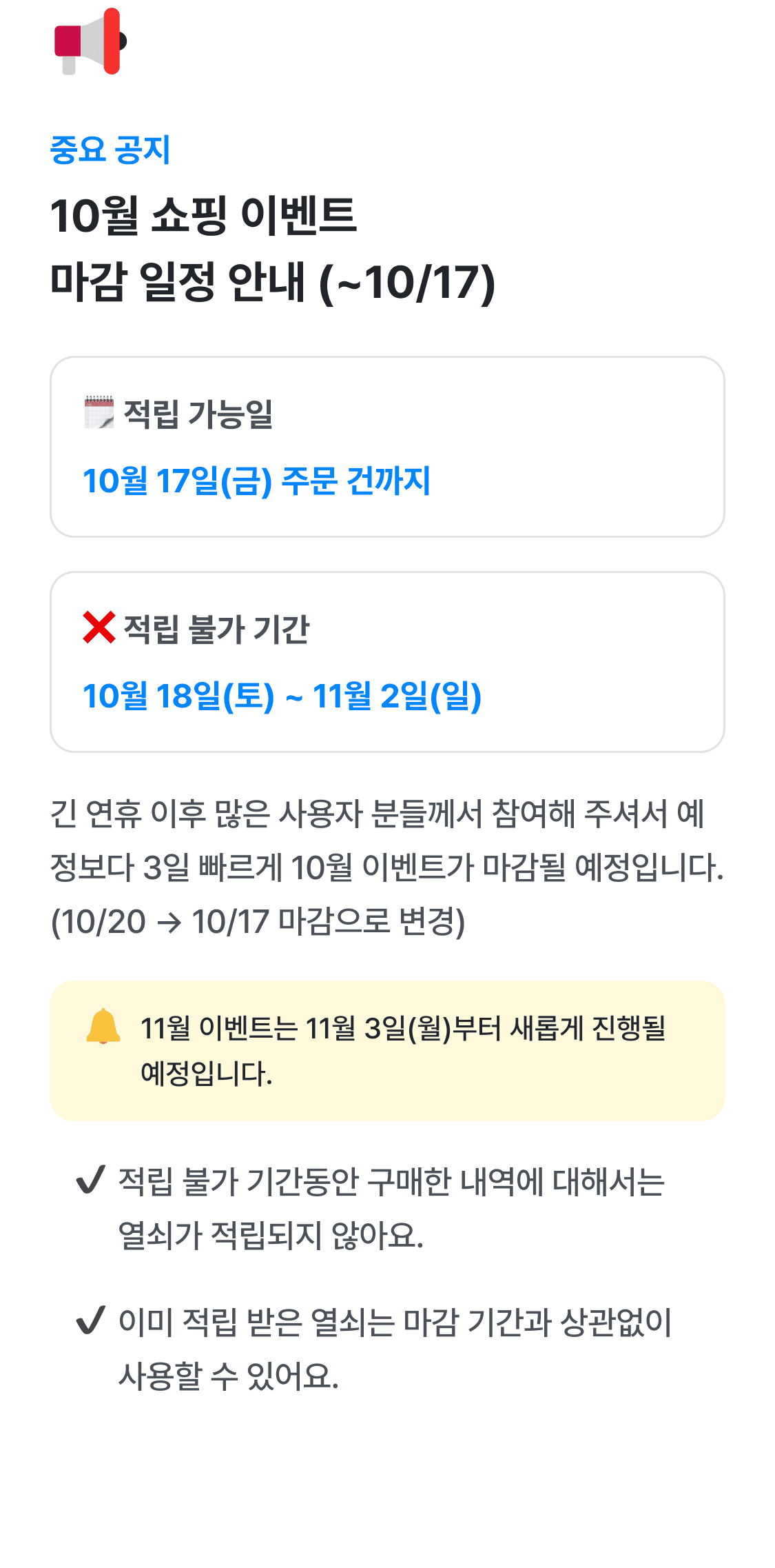 적립 불가 기간 : 10월 18일(토) ~ 11월 2일(일)