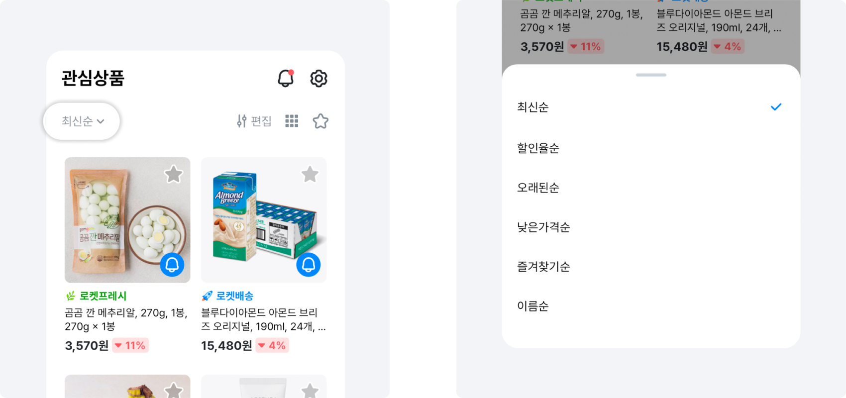 최신순기본적으로 최신순으로 설정되어 있어요.최근에 추가한 상품 순서대로 볼 수 있어요.할인율 순할인율이 높은 순서대로 볼 수 있어요.오래된순먼저 추가한 상품 순서대로 볼 수 있어요.낮은 가격순가격이 낮은 상품 순서대로 볼 수 있어요.즐겨찾기순즐겨찾기한 상품을 우선적으로 볼 수 있어요.이름순상품 이름을 기준으로 가나다 → ABC 순서대로 볼 수 있어요.