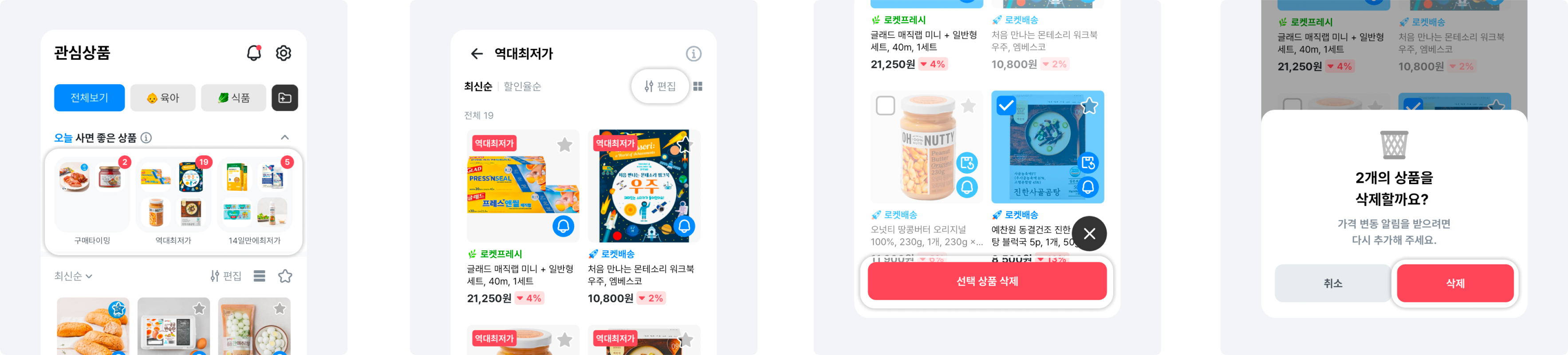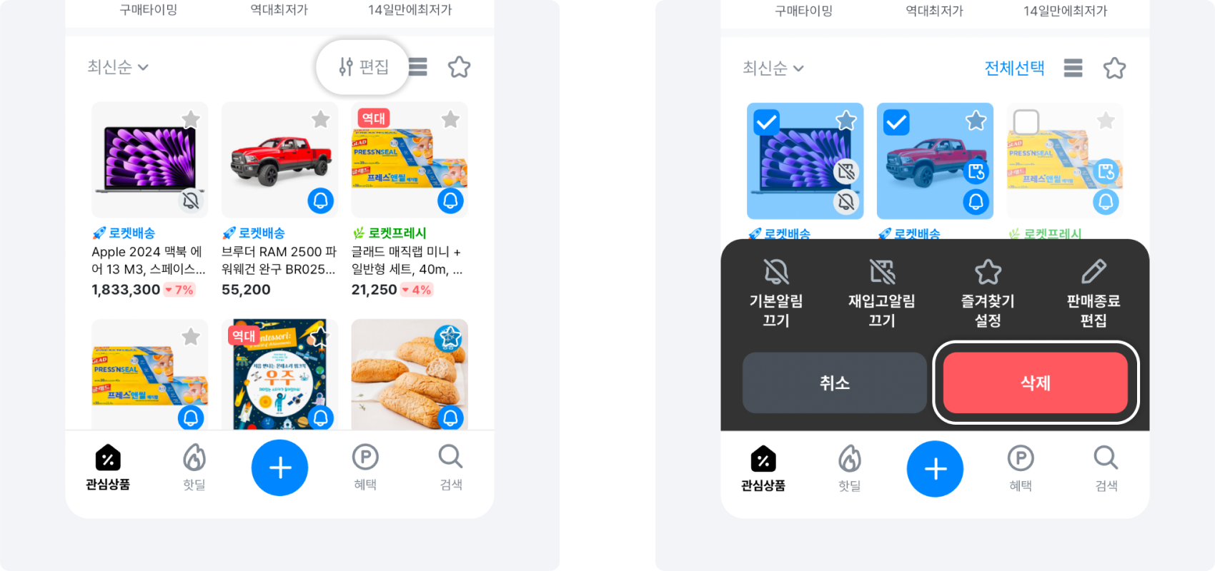 관심상품 목록 [편집] 또는 상품 꾹 누르기(롱탭) → 상품 선택 → [삭제]