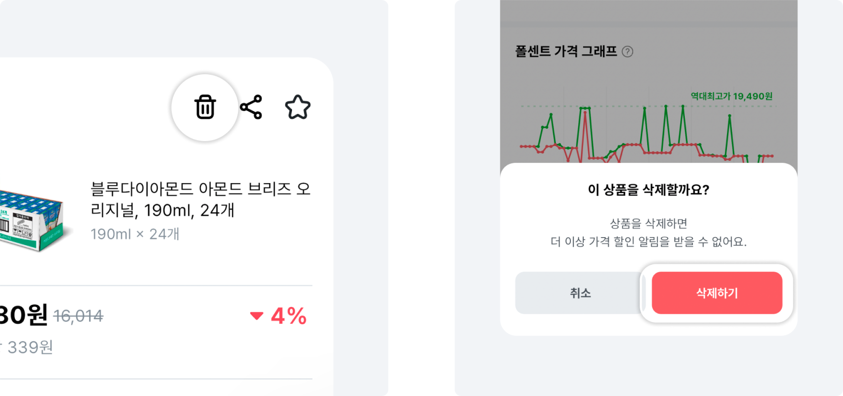 상품 상세페이지 → 오른쪽 상단 휴지통 아이콘