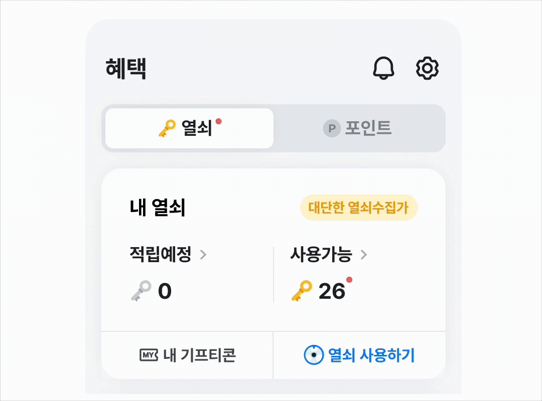 열쇠와 포인트 내역을 이제 각각의 전용 페이지에서 개별적으로 관리해 보세요.