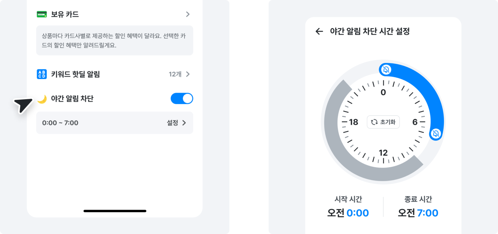 새벽에 알림을 받고 싶지 않다면 야간 알림 차단을 설정해 주세요. 야간 알림 차단 시간을 설정하면 설정한 시간동안 알림을 보내지 않아요.