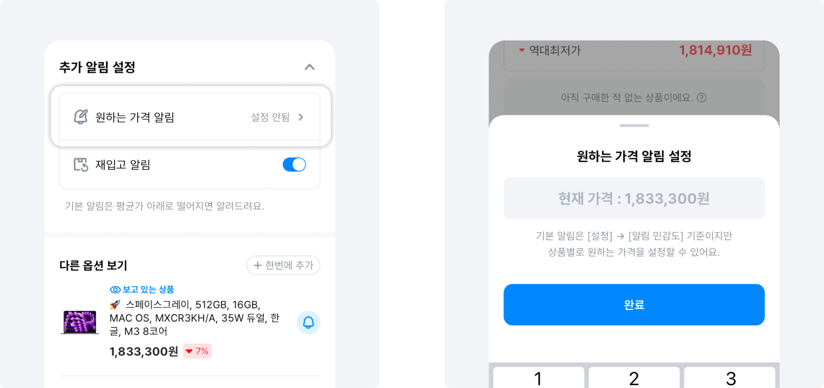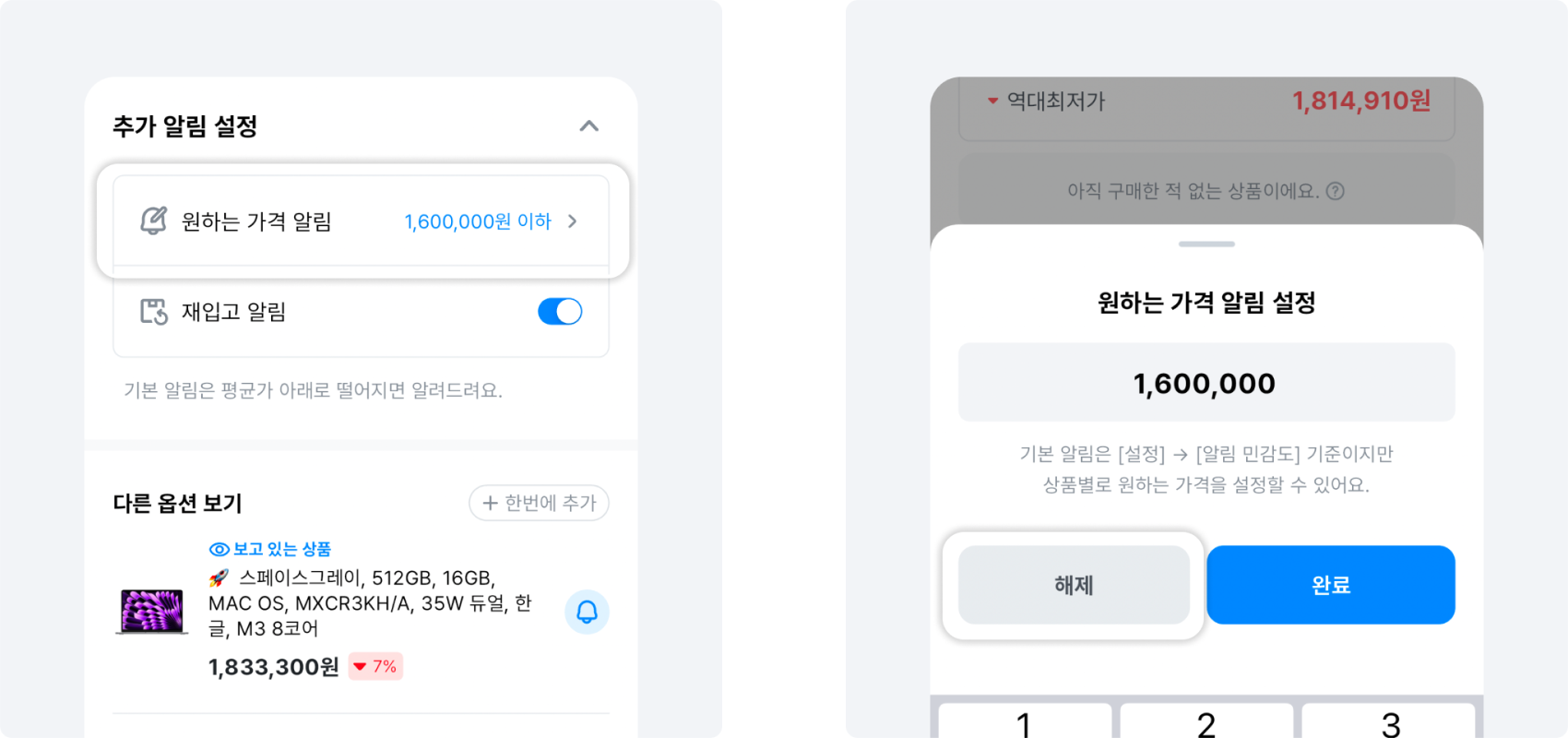원하는 가격 알림을 설정한 후 기본 알림을 껐다가 다시 켜도, 이전에 설정했던 가격은 초기화되지 않기 때문에 해당 가격 설정에 따라 다시 알림을 보내드려요.