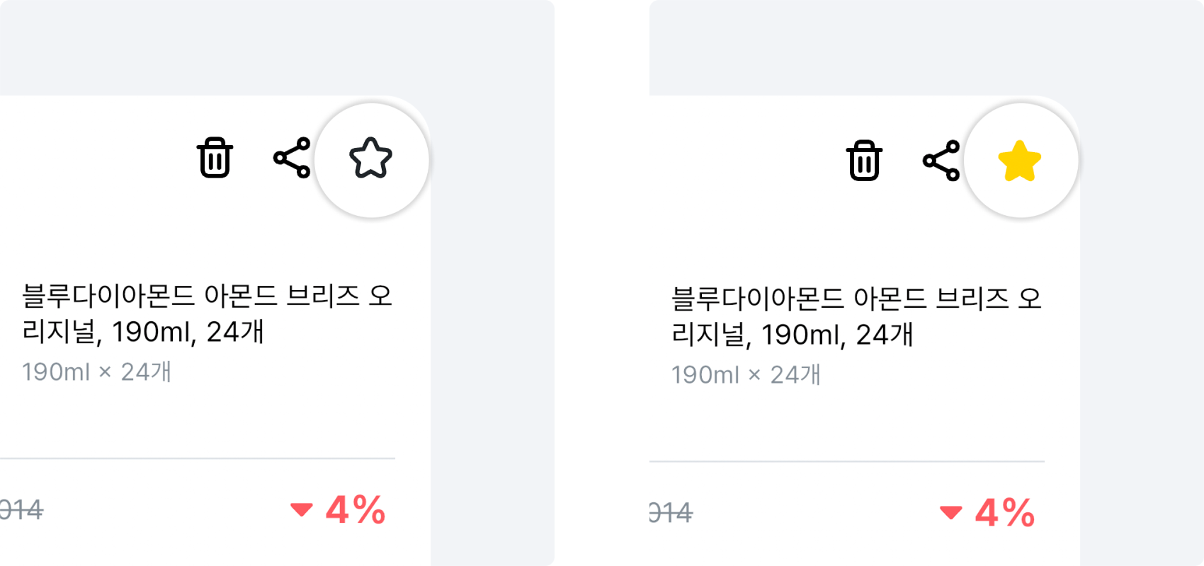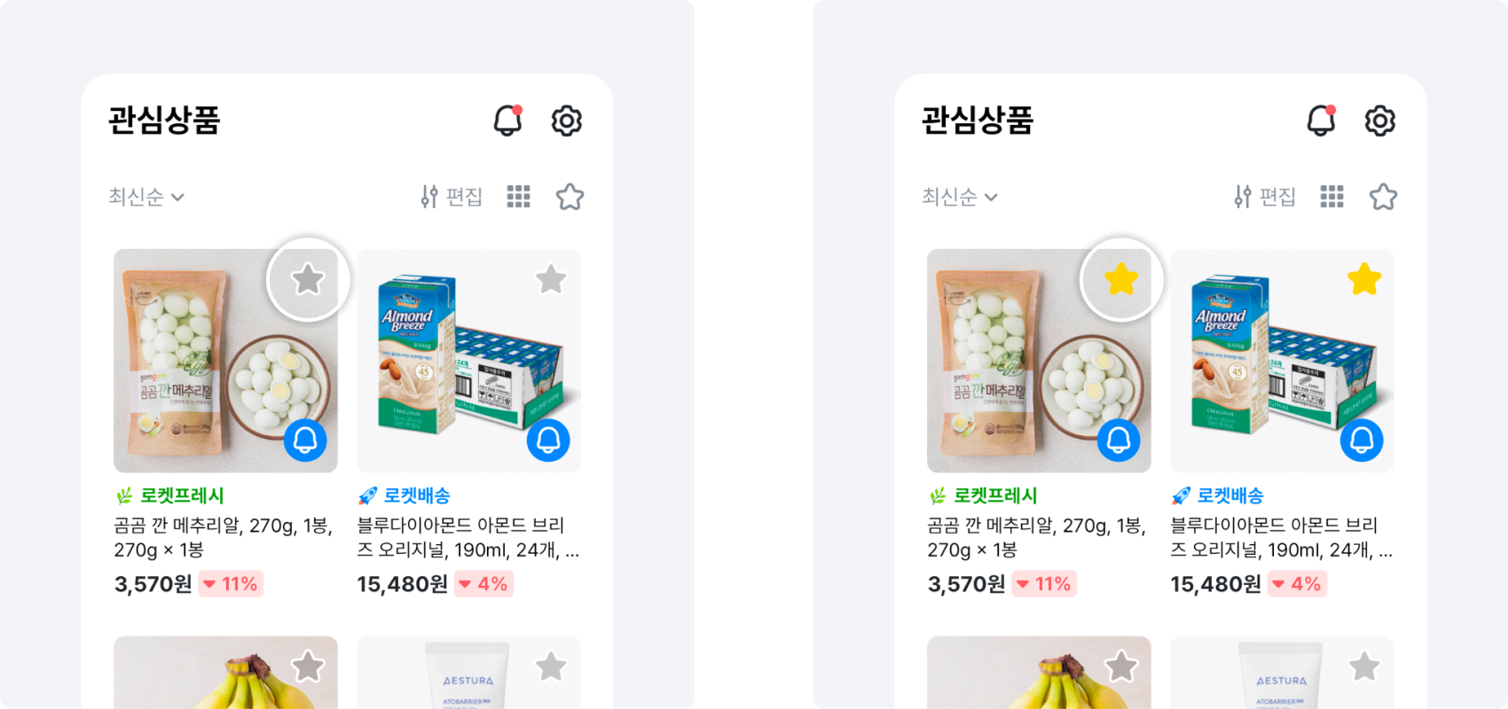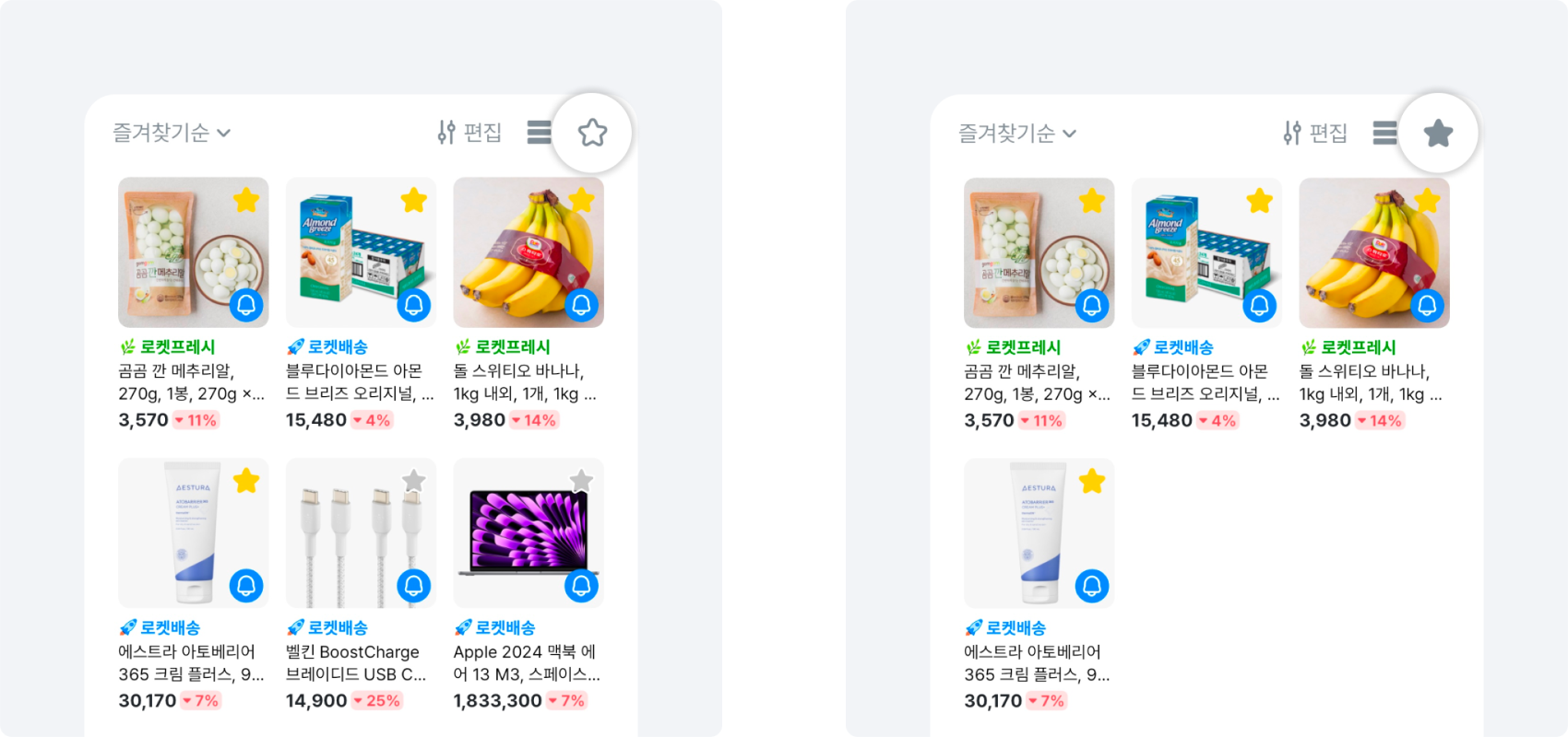상품 썸네일에서 ️⭐️별모양 버튼을 누르면 즐겨찾기를 설정, 해제할 수 있어요.