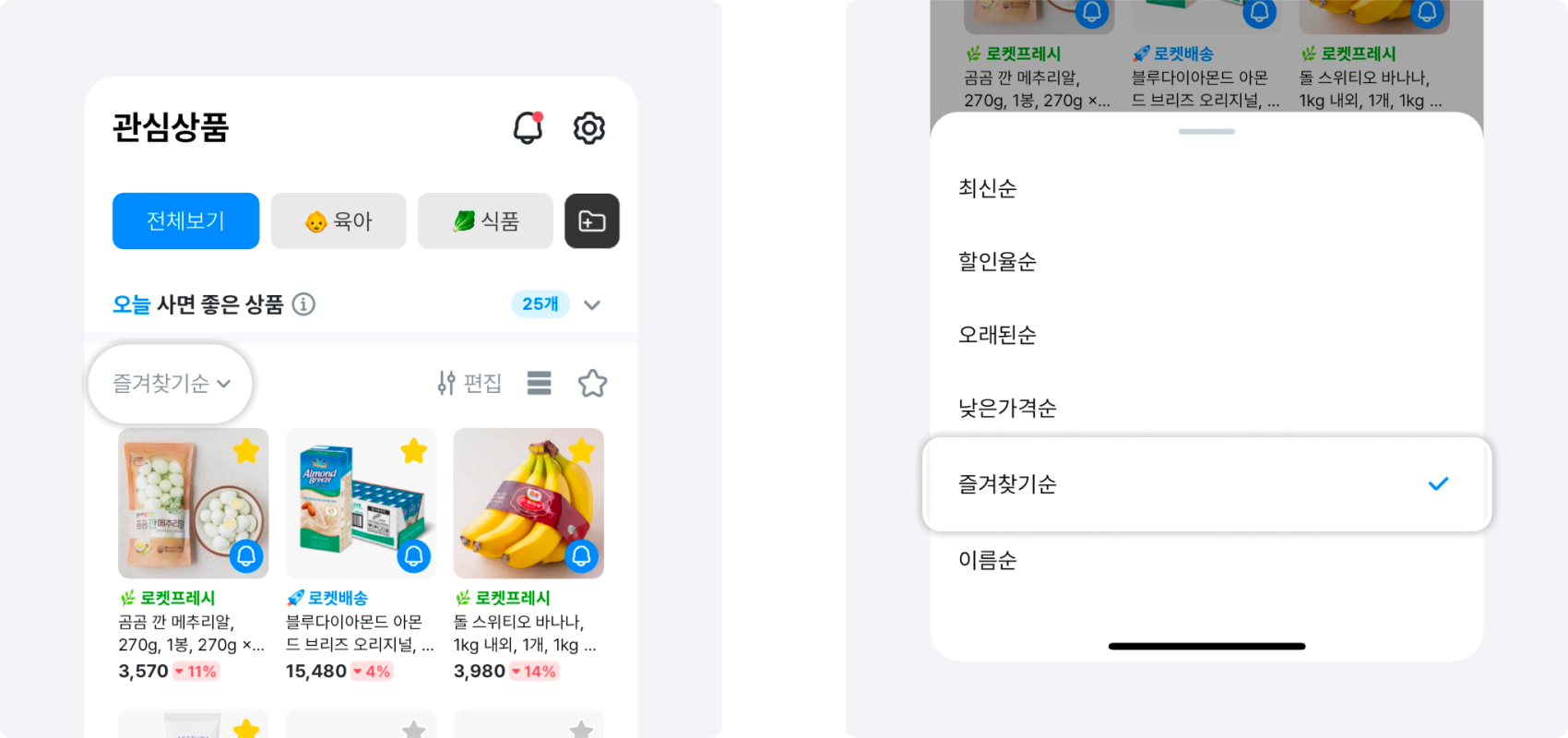 상품 정렬을 즐겨찾기 순으로 선택하면 즐겨찾기한 상품을 우선적으로 볼 수 있어요.