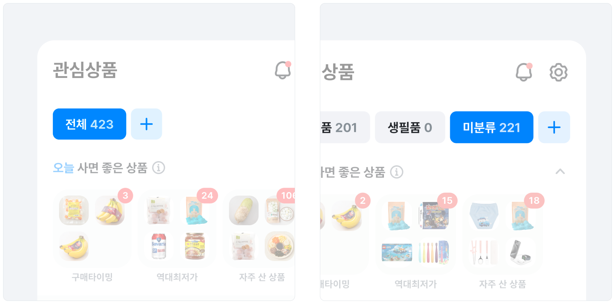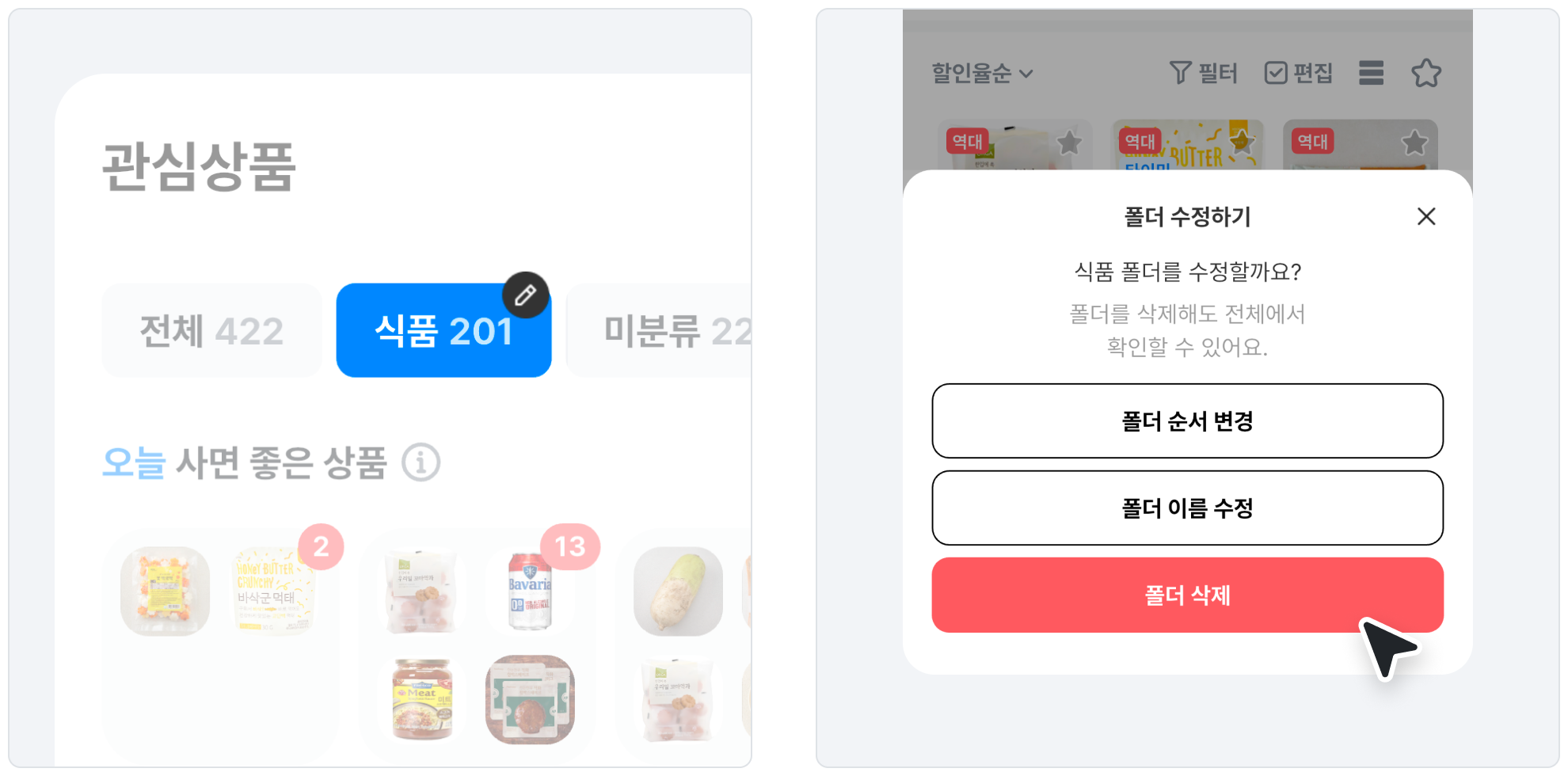 폴더에 분류한 상품과 분류하지 않은 모든 상품을 볼 수 있어요. 전체 폴더 옆의 숫자가 내 관심상품 수에요.